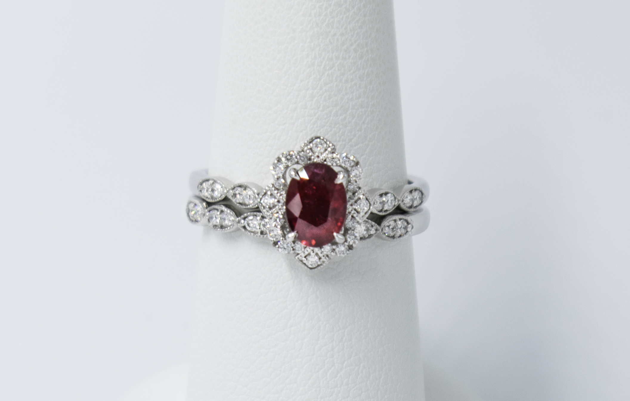 Custom Vintage style 0.93ct Natural AA quality Ruby w/Diamonds0.33 carats Wedding set with a halo