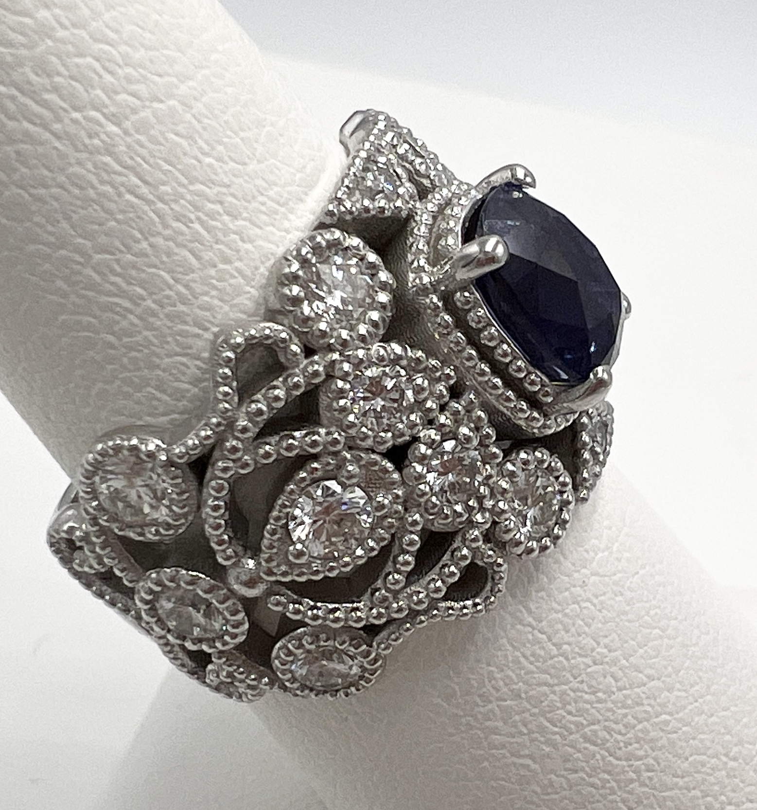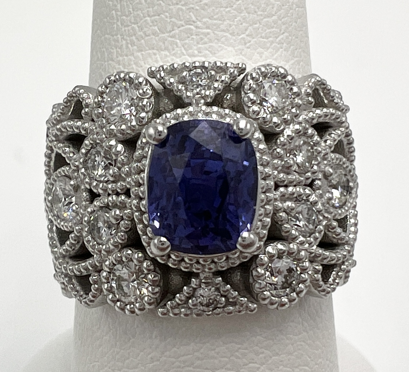 10kw 2.56ct Cushion Purple Sapph 0.60cts Dia Vintage Style Size 7.5 wide Ring 8×6.27mm from Sri Lanka Natural Diamonds G-H color and SI1-VS2 clarity Wide Band