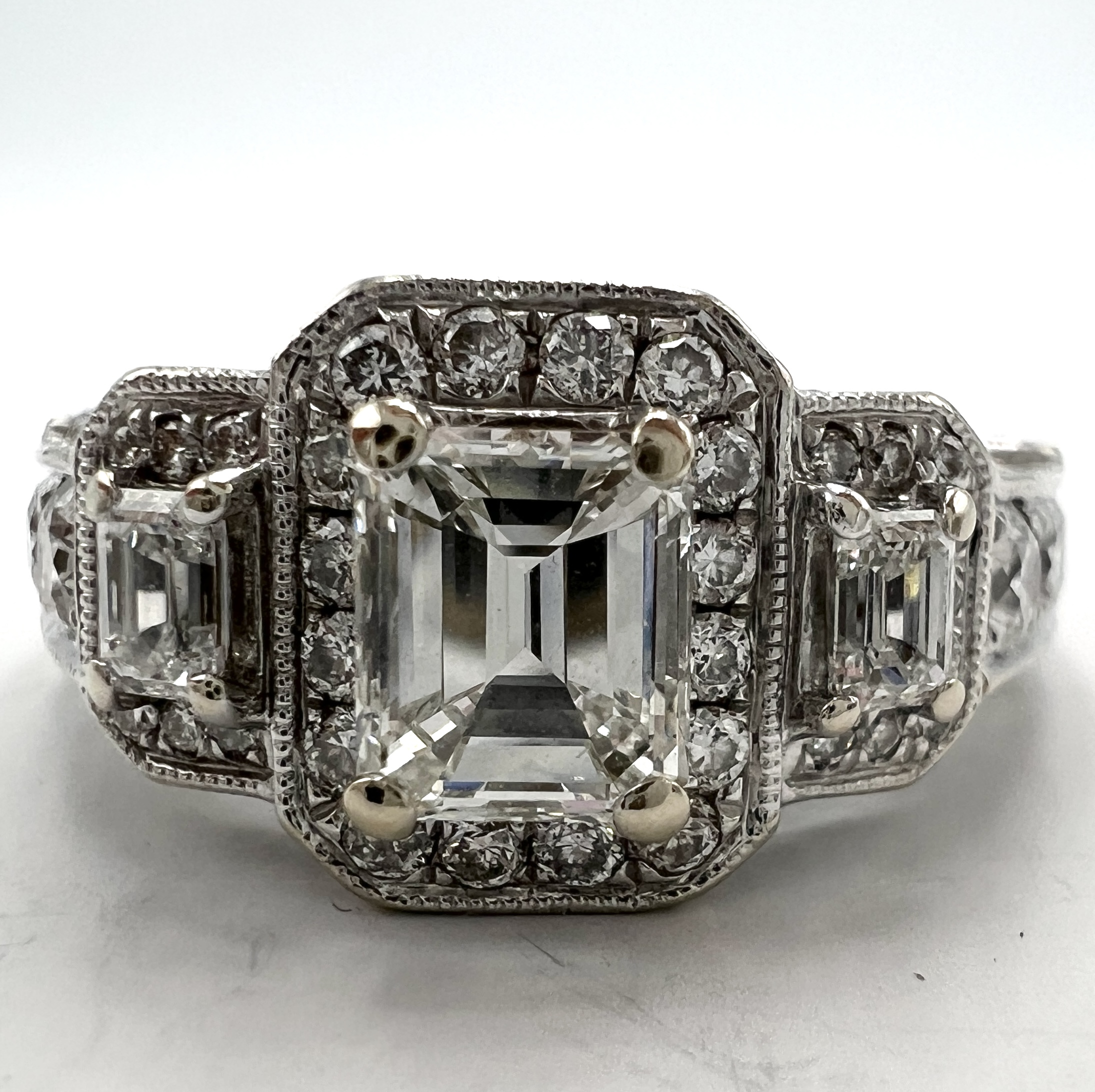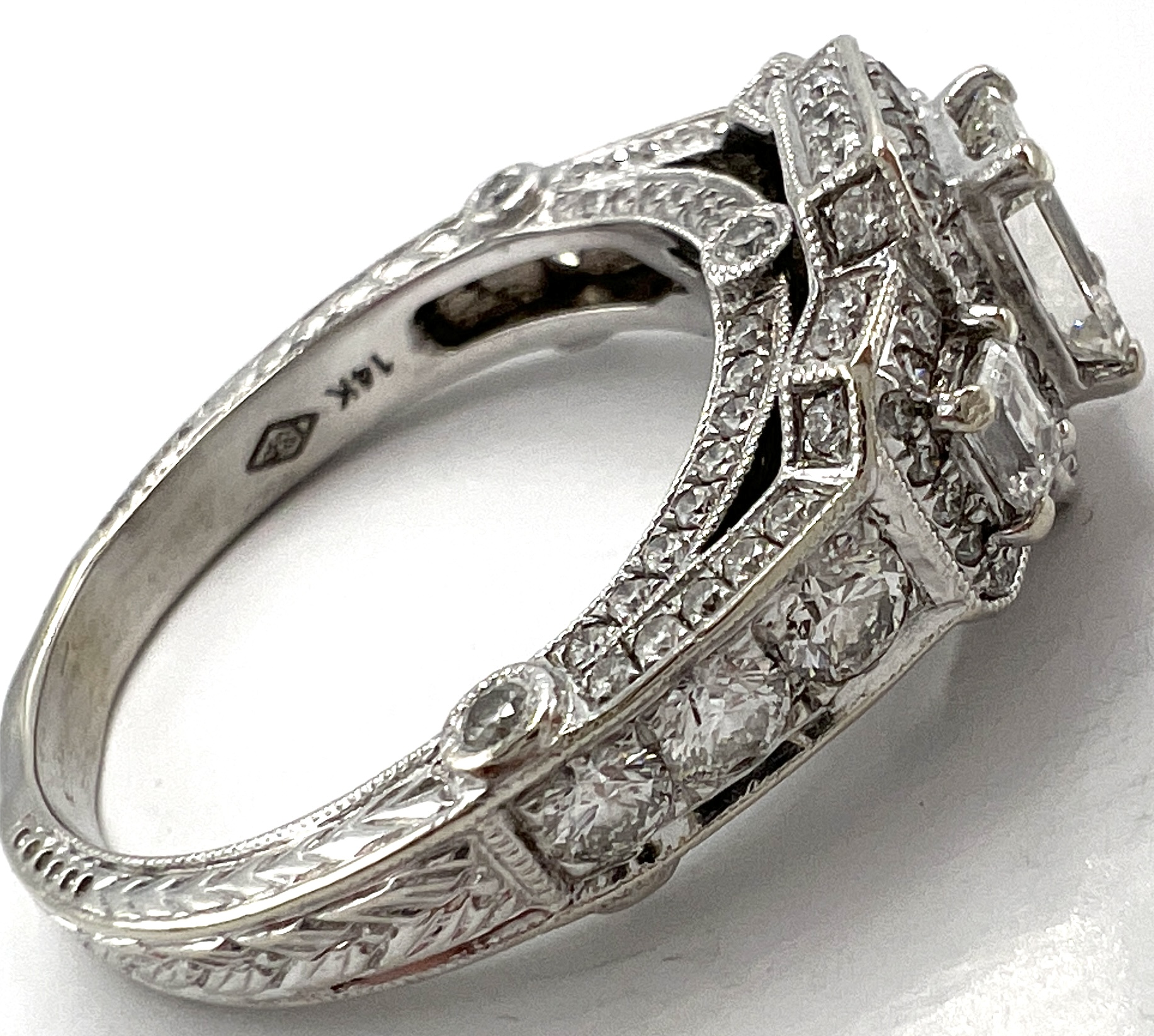 14K White Gold 2ctw Natural Diamond 3 Stone Halo Engagement Ring w/ Milgrain Edge and Engraving (1ct Center, 0.10ct Sides, 0.90ctw Accents)