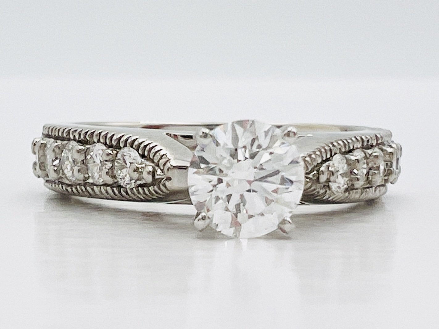 14k White Gold Vintage Style with Milgrain and a 0.60ct LAB Diamond center with 0.35 carats of Bead Set Natural Diamonds in the Shank