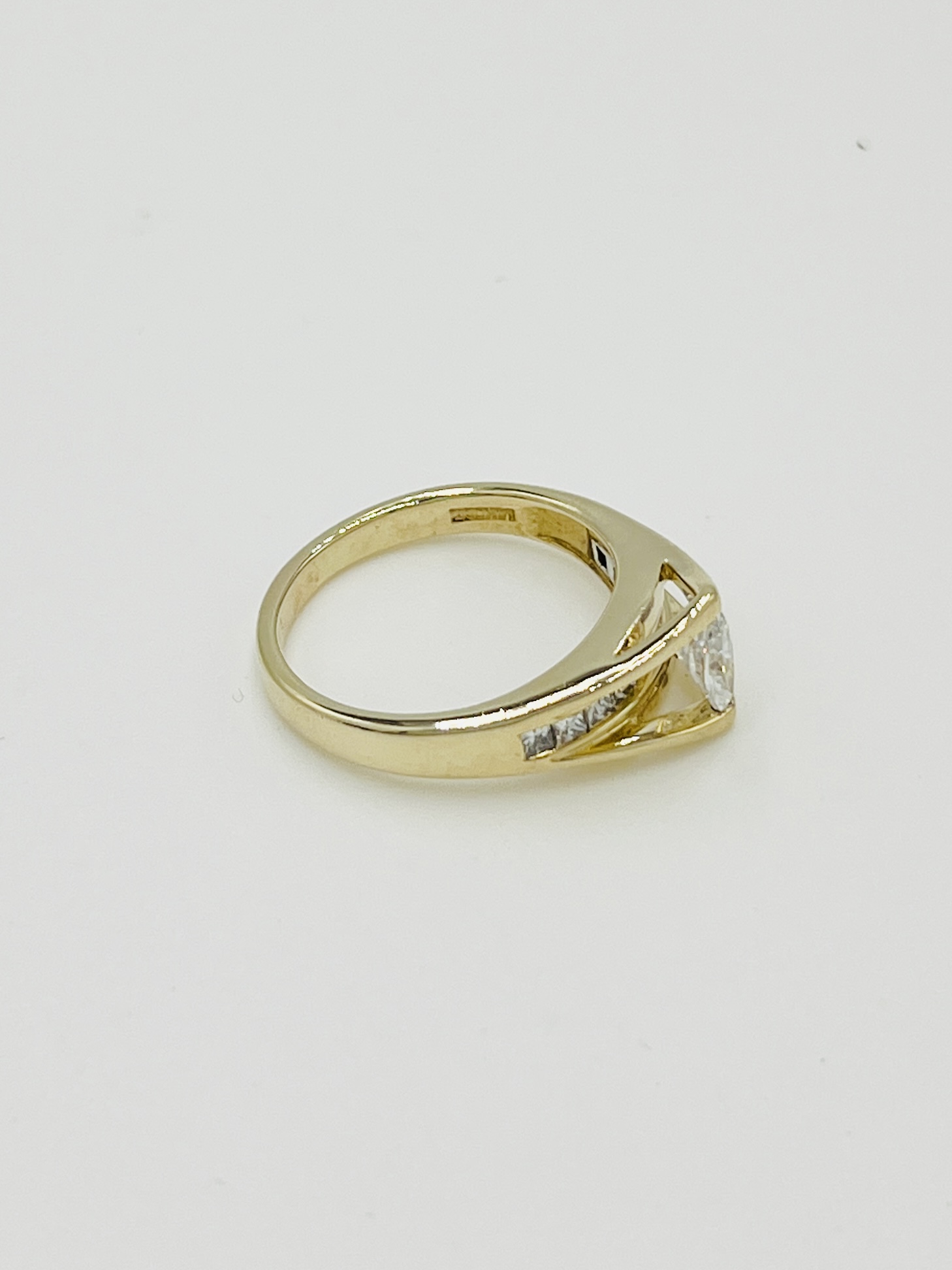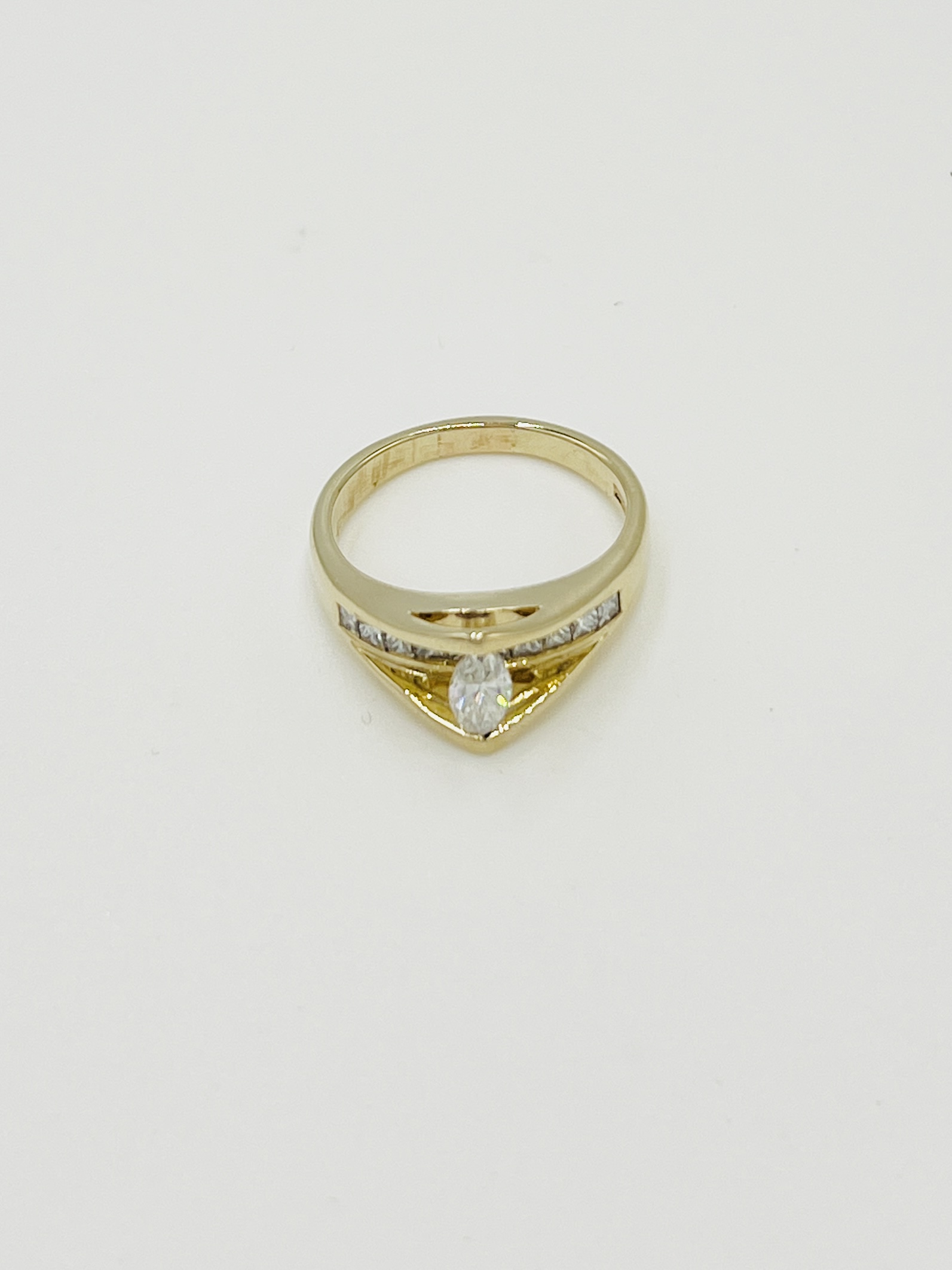 14kt Yellow Gold 1.5ctw Natural Marquis Diamond Bridge Ring with Natural Diamonds, The Shank has Princess Cut Diamonds Channel Set.