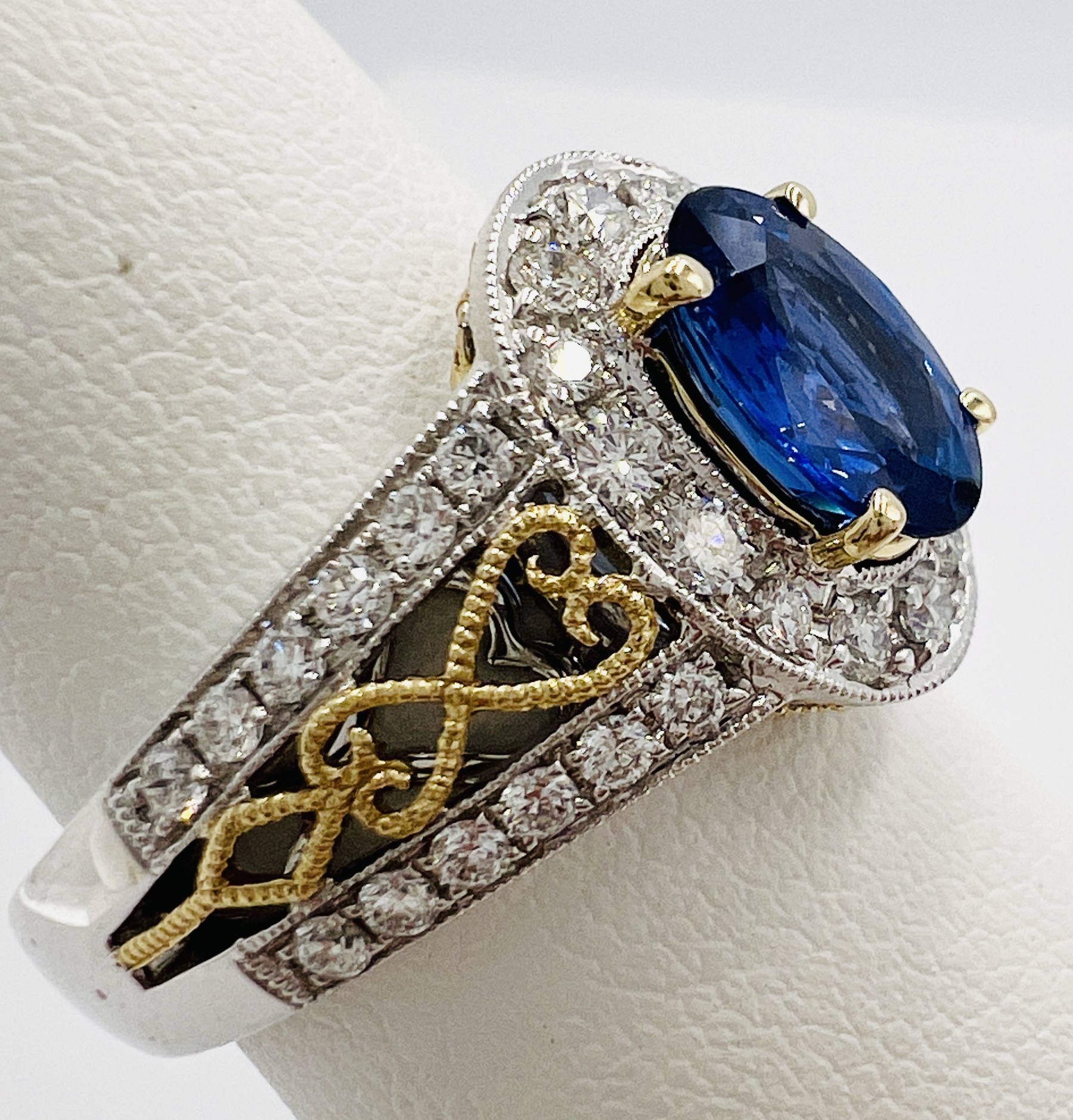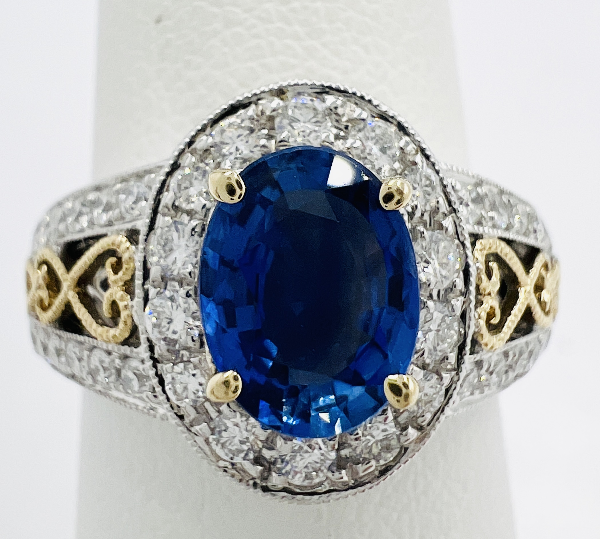 14kt two tone gold Vintage Style 1.77ct oval Sapphire AA Cobalt Blue Filigree Style and 0.52 carats of Natural Diamonds