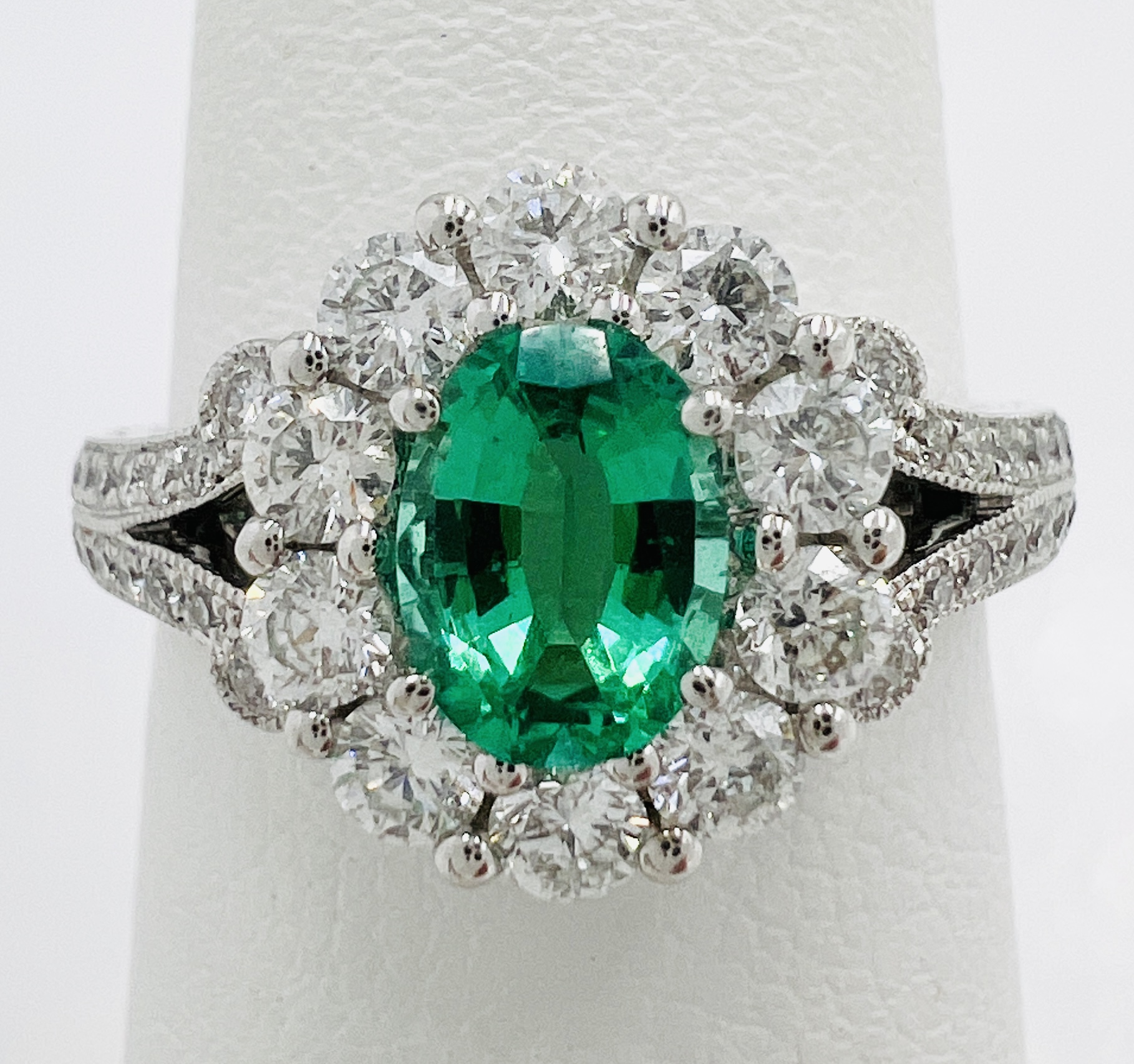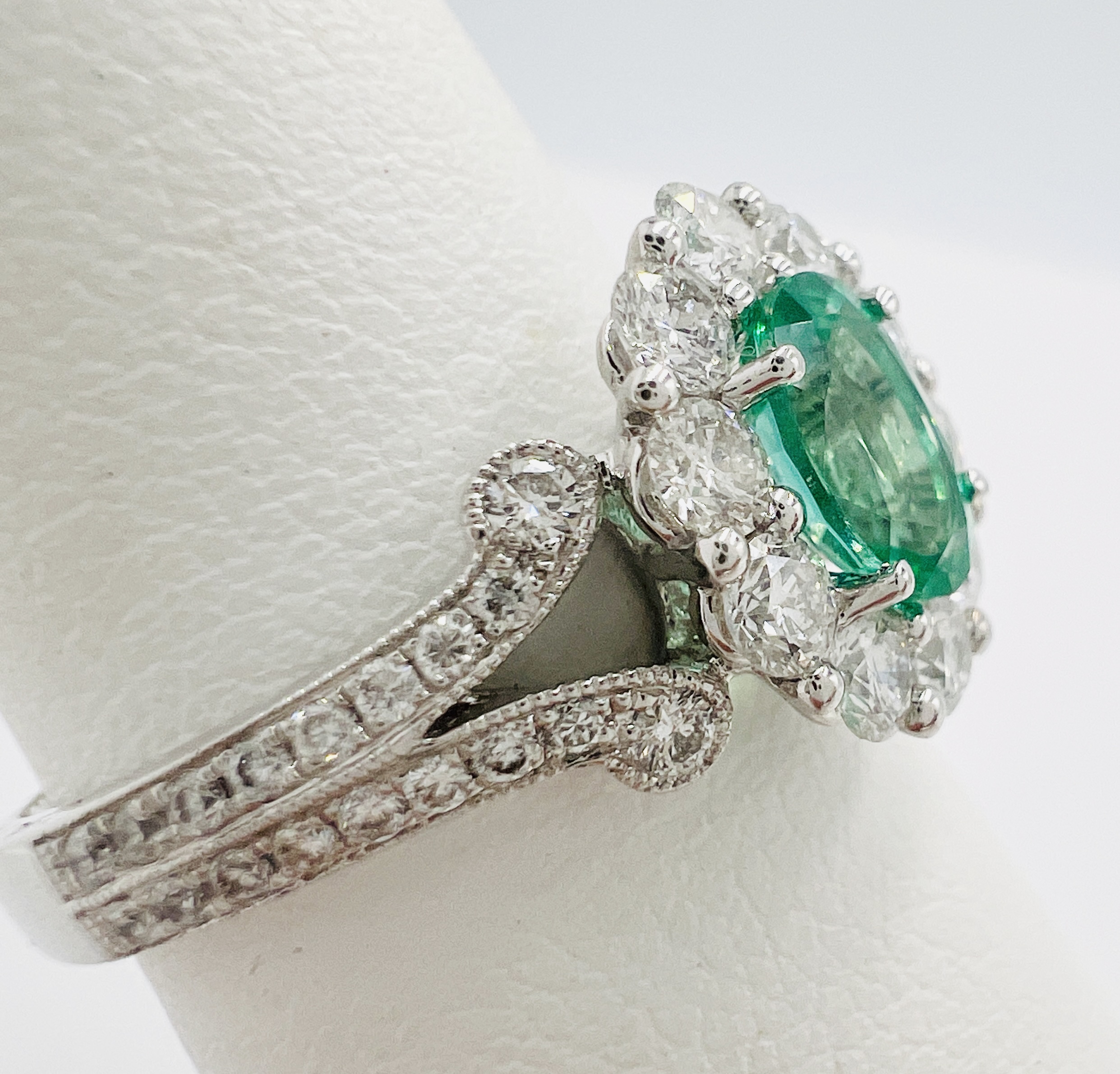 14kt white gold split shank, large accent diamonds and a 0.64ct Natural Emerald Medium to Light Green with Natural Diamond Halo 0.84ct