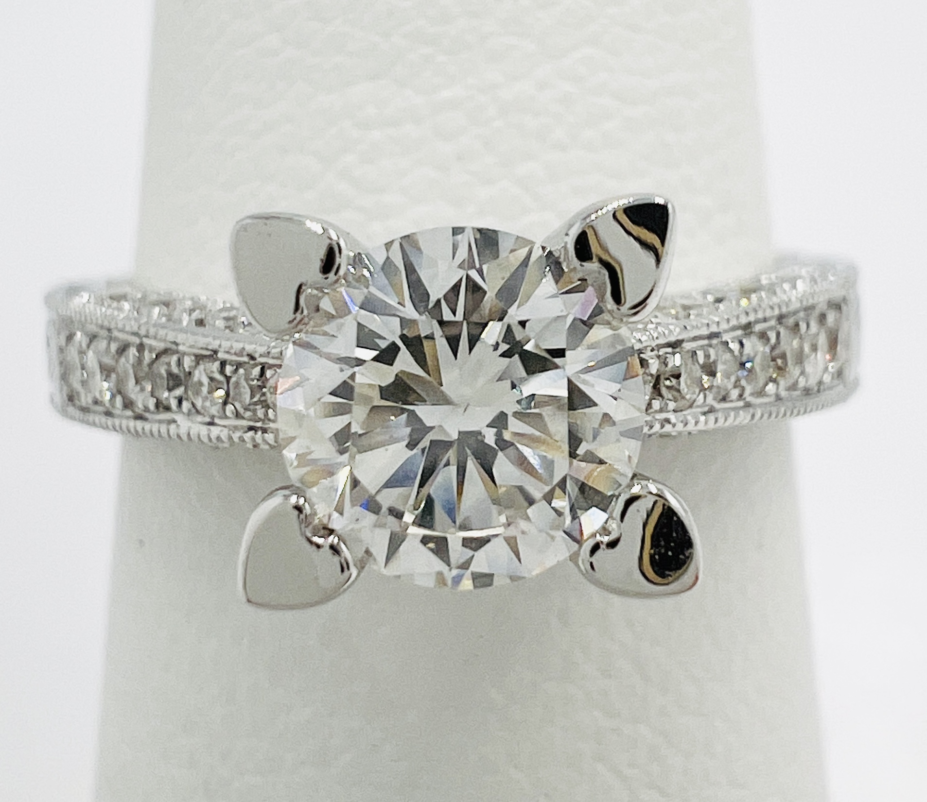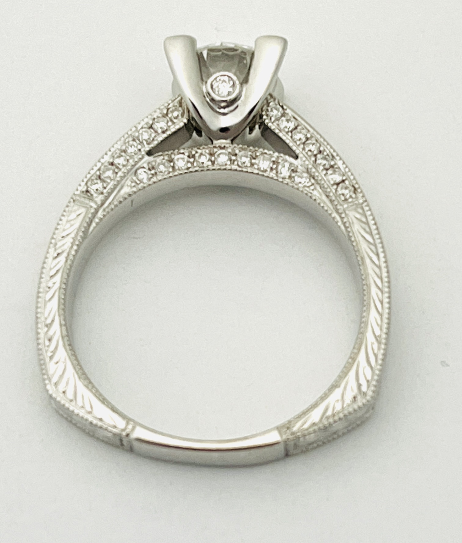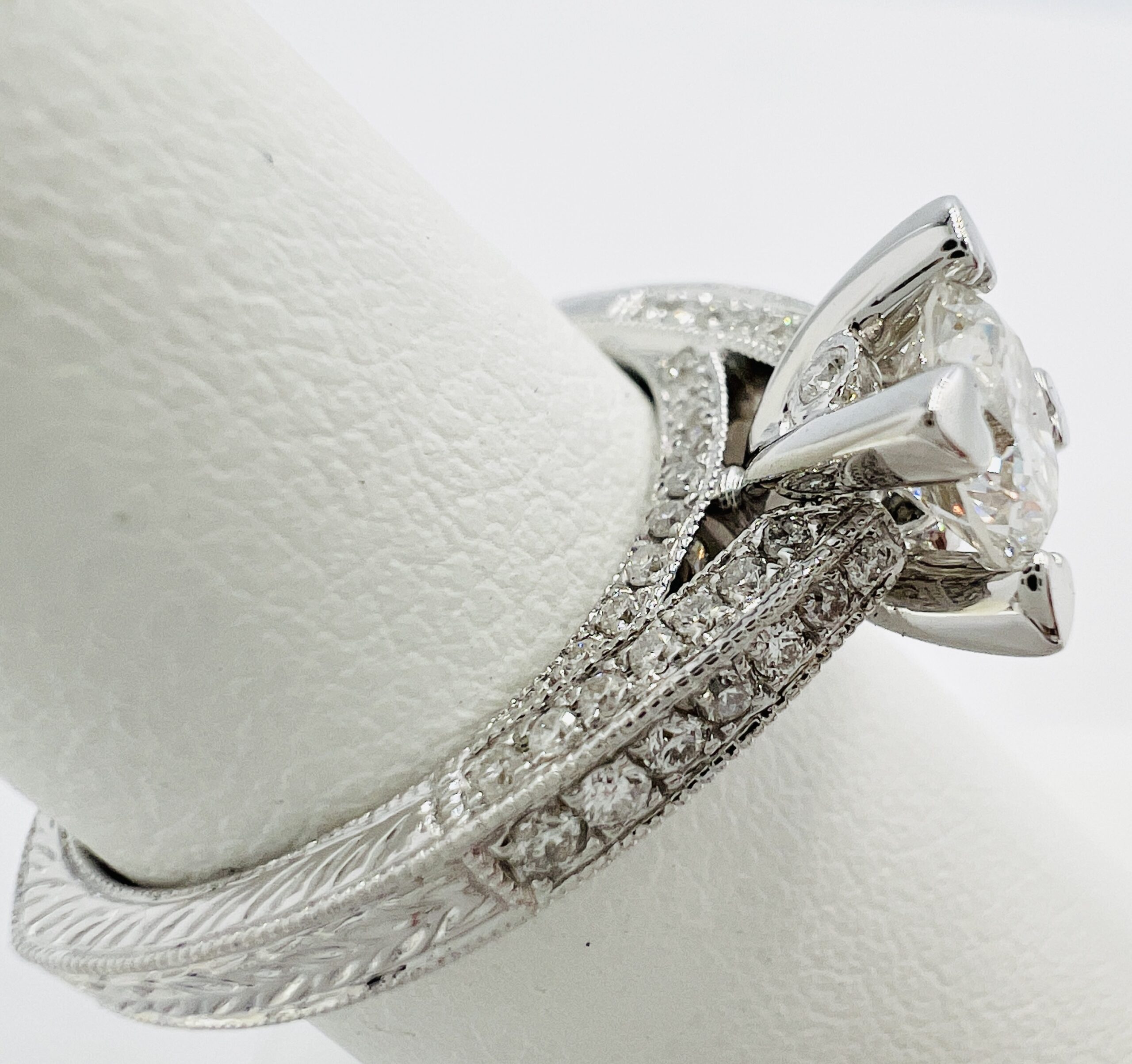Vintage Style Hand Engraved 14kt White Gold Ring with a 0.81ct Lab Grown Center Dianmond and 0.39cts total Natural Diamonds Pave on All Sides with Euro Shank