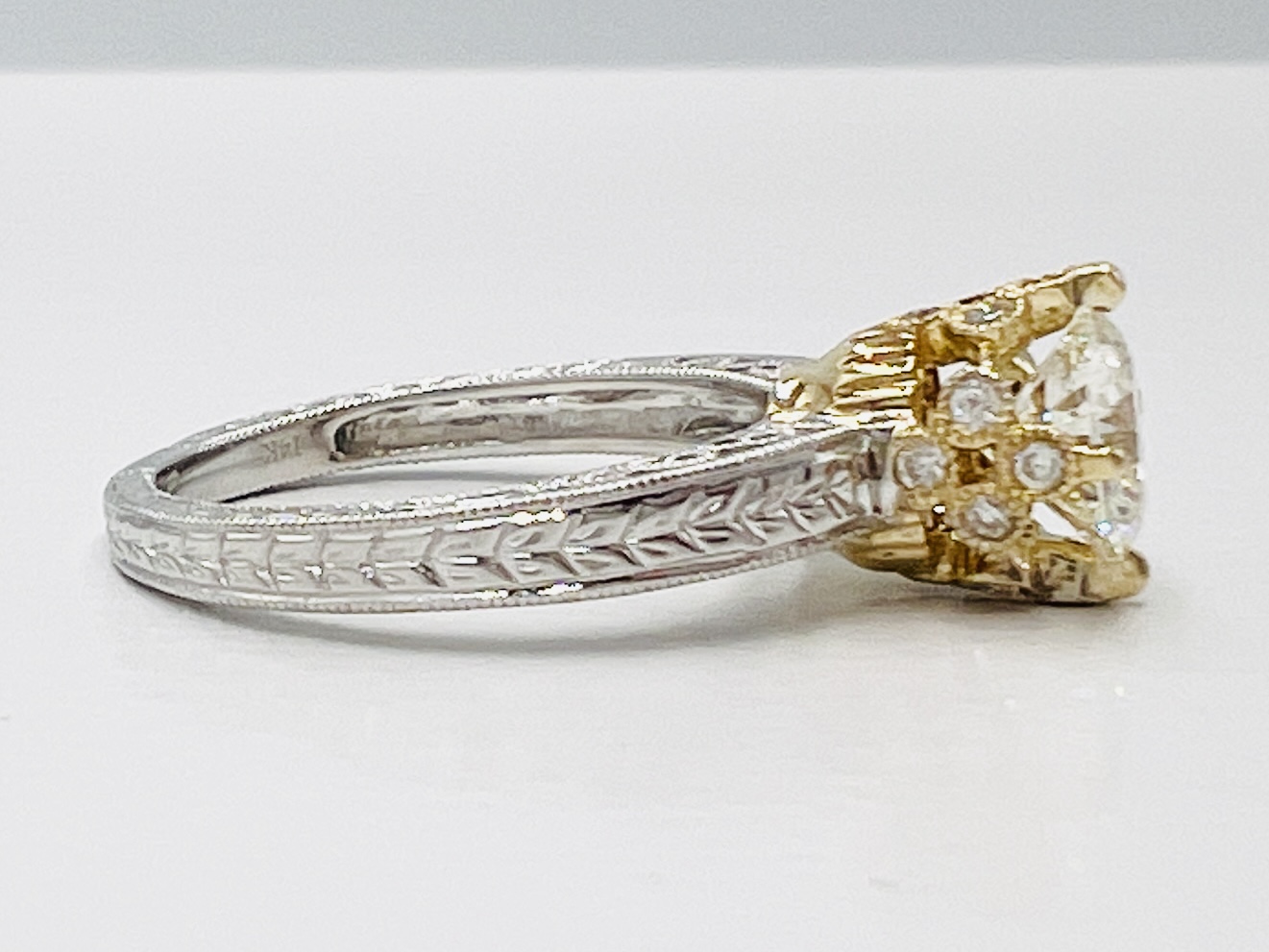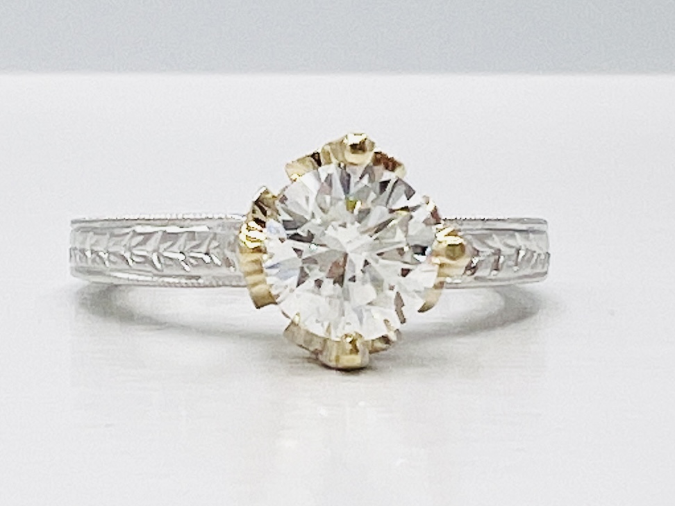14k White Gold and 18kt Yellow Gold Hand Engraved Princess Crown Ring with a 1 carat Natural GIA certified Diamond I-J and SI Quality with 0.16ctw in the Crown