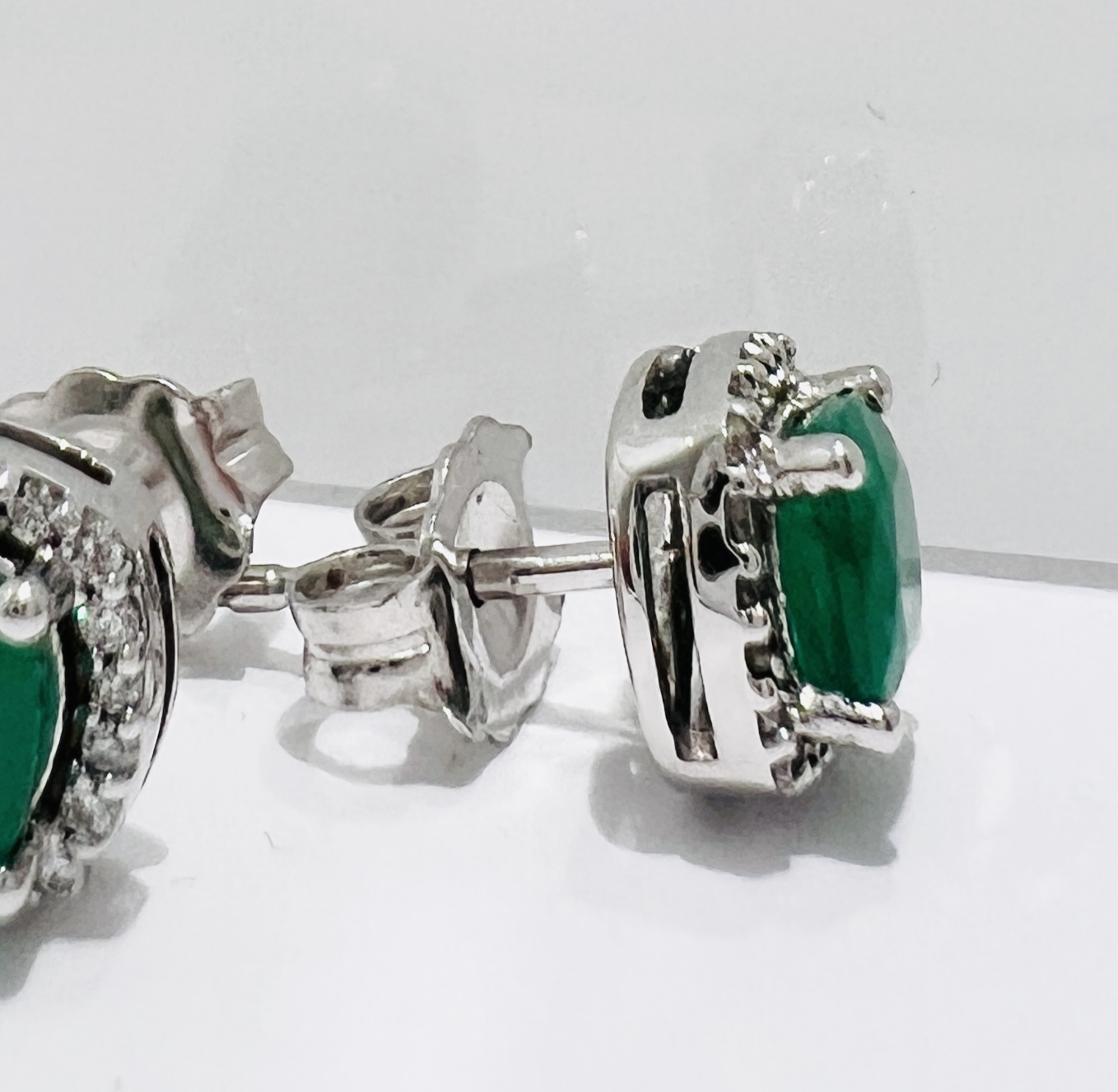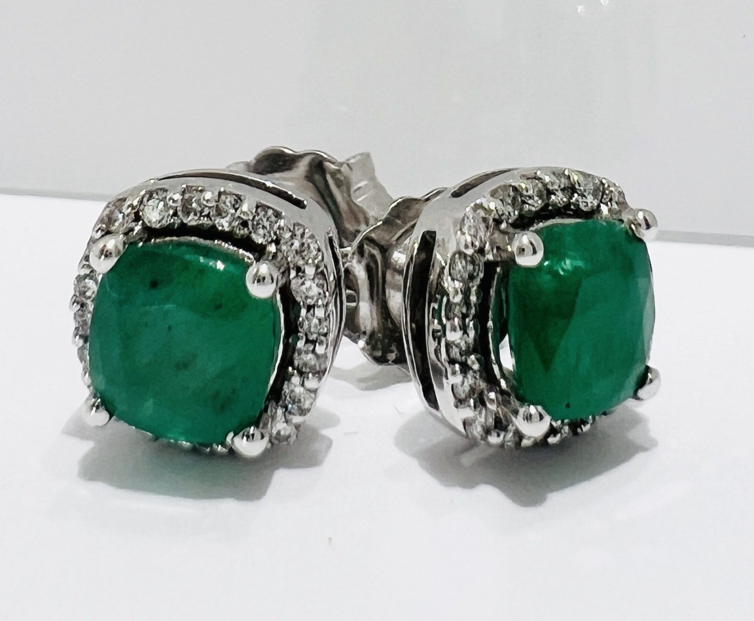 14k white gold Cushion Emerald 1.20 ctw and Diamond 0.15 carats Halo Stud Earrings