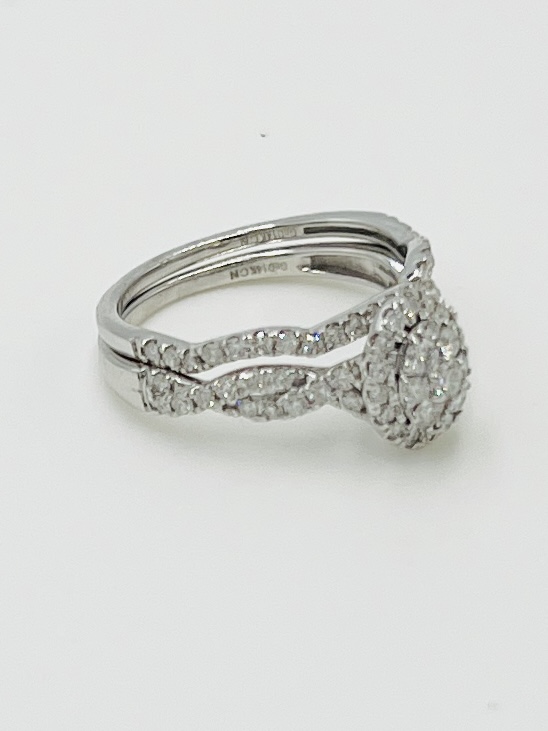 14kt White Gold Natural Diamond Oval Cluster 1 carat Total Diamonds Wedding Set with Halo and Twisted Infinity Style Fitted Band