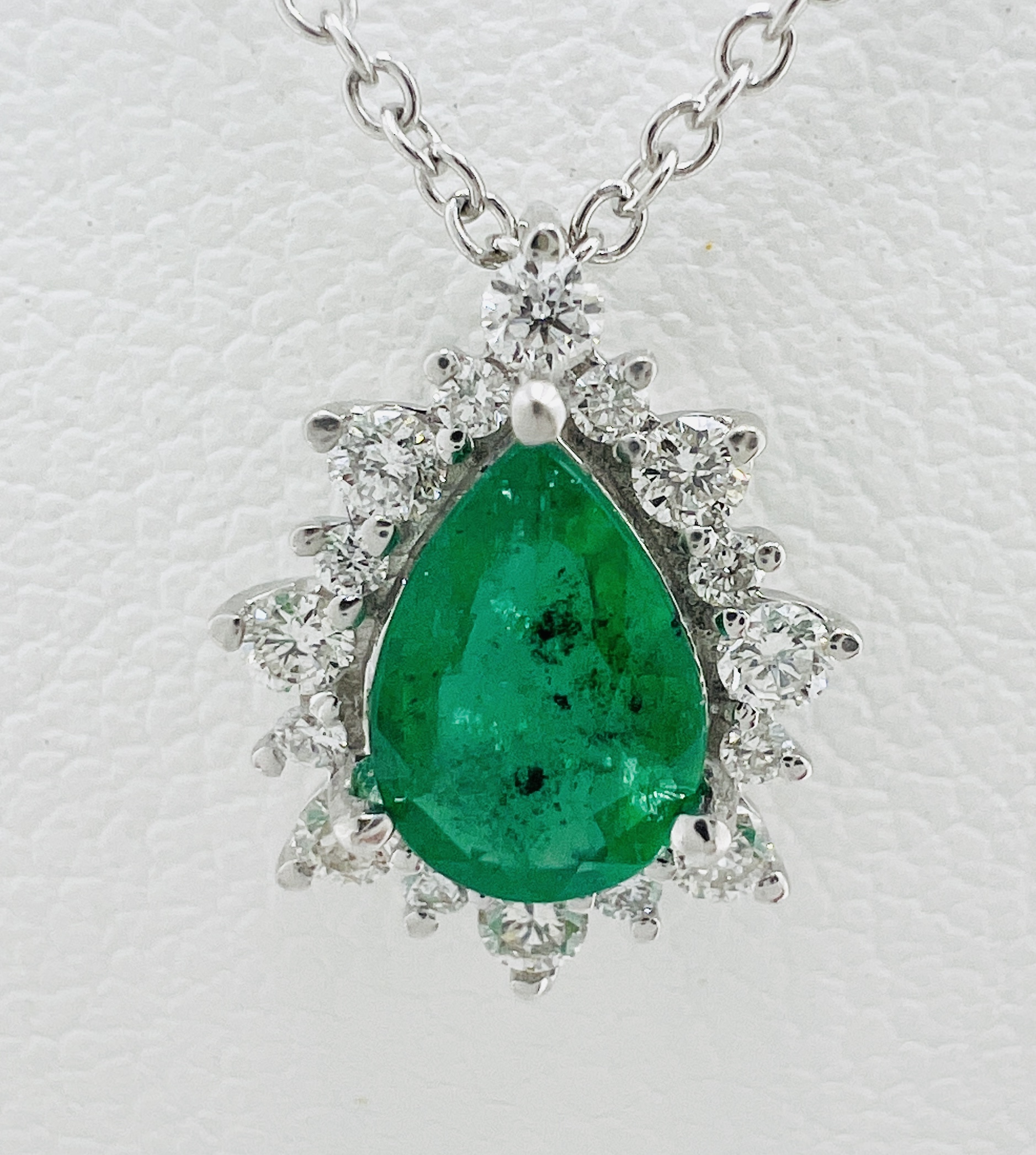 14k white gold Pear Shaped.45ct Emerald/Diamond Halo Necklace 0.18ct diamond