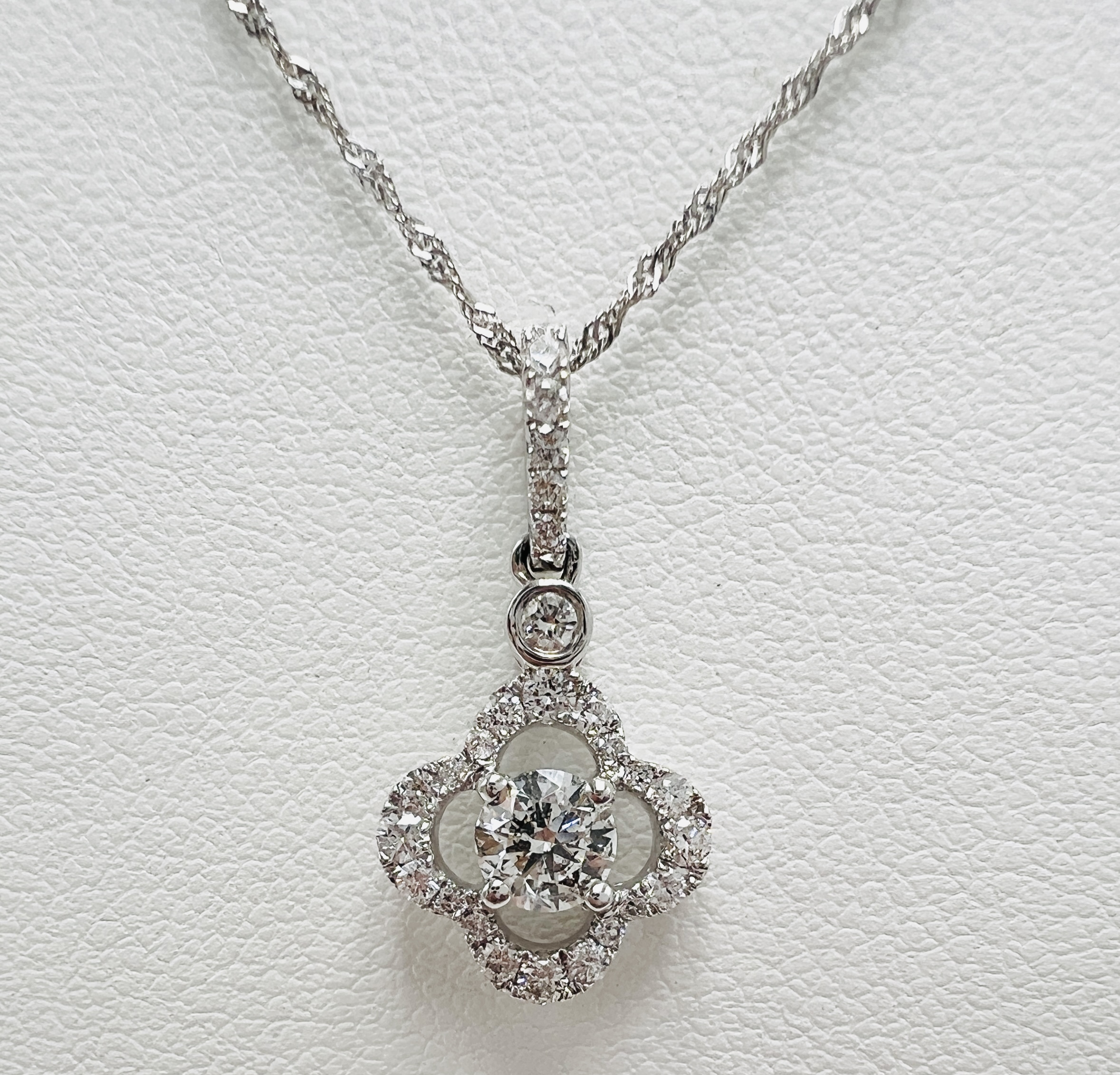 14K White Gold Quatrefoil 0.88ctw Diamond Pendant On 18″ 14K White Gold Singapore Chain