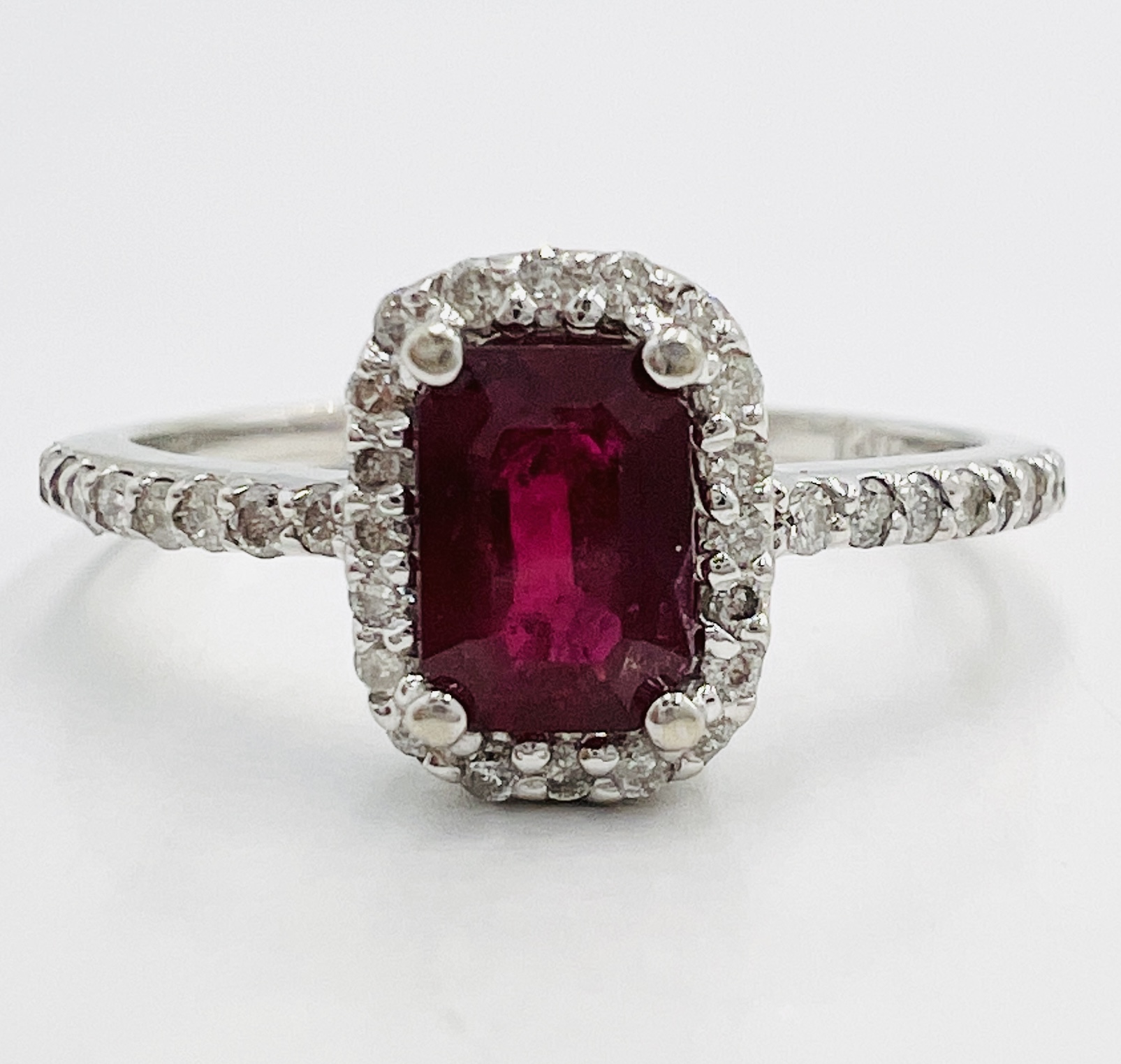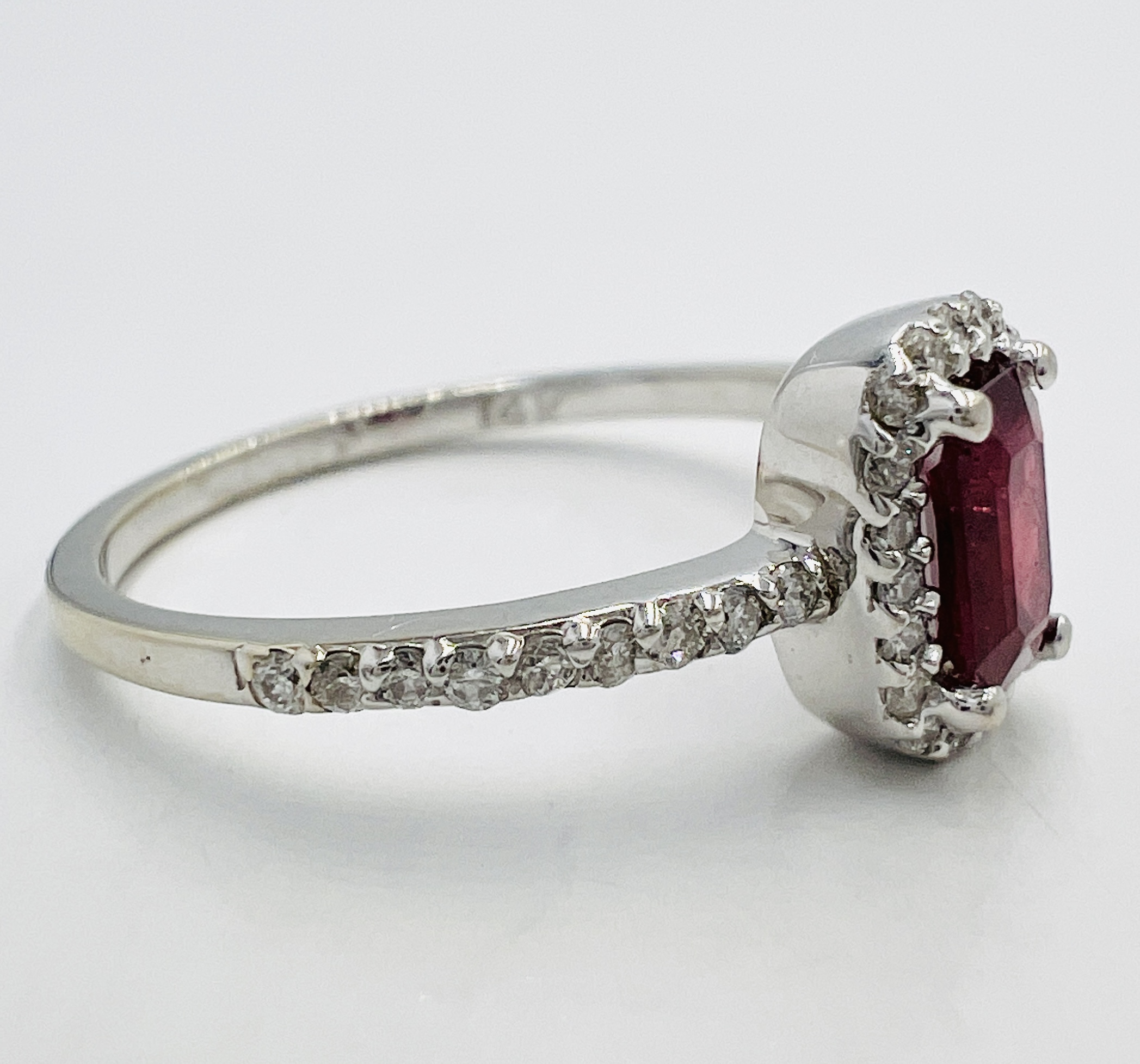 14kt white gold halo ring with a 0.50 carat 6X4 Emerald cut natural RUBYand 0.25 cts of natural diamonds