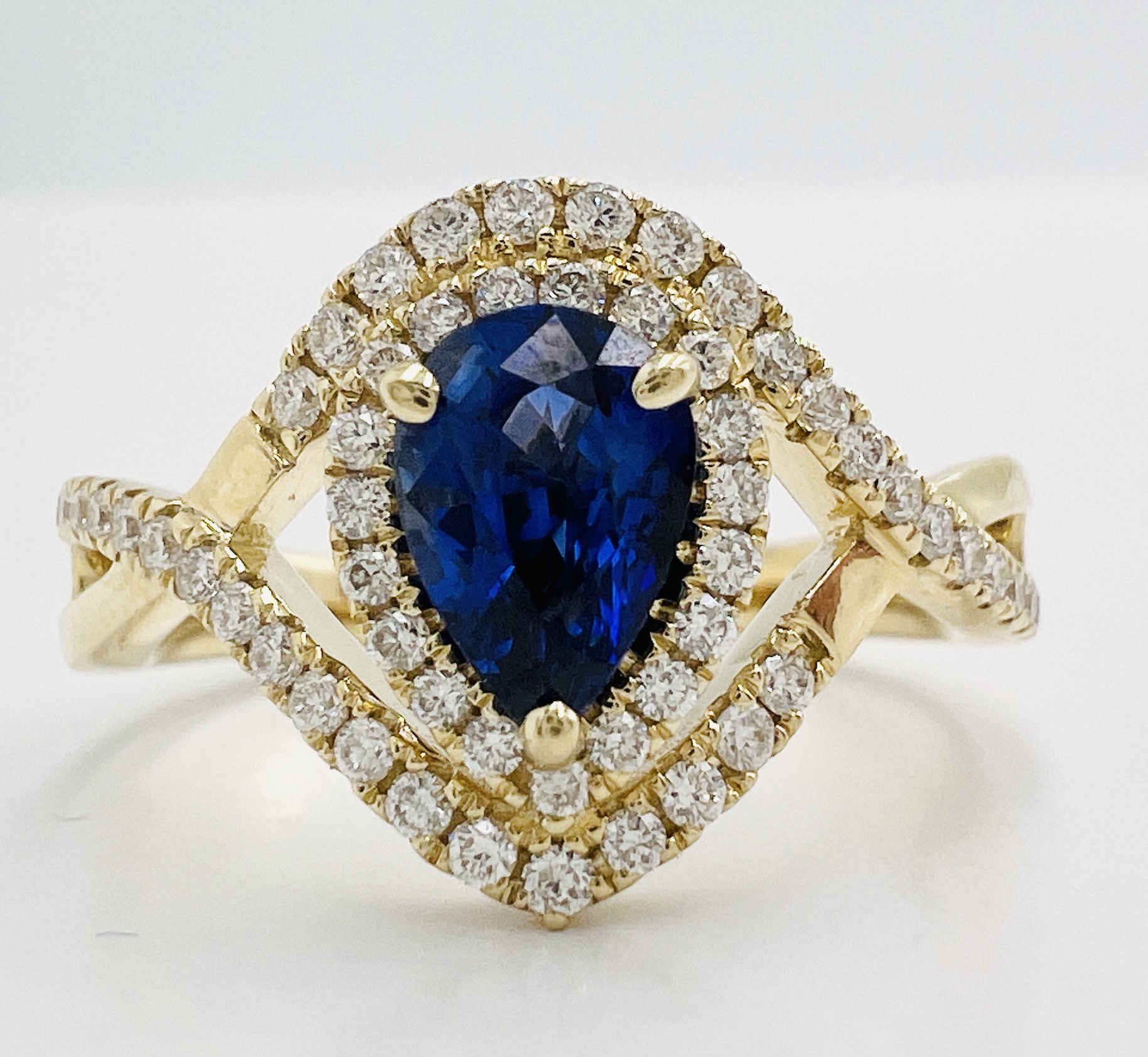14k yellow gold 0.86ct Pear Shaped Natural Sapphire AA medium blue Ceylon and Diamond Halo Twist 0.33carats