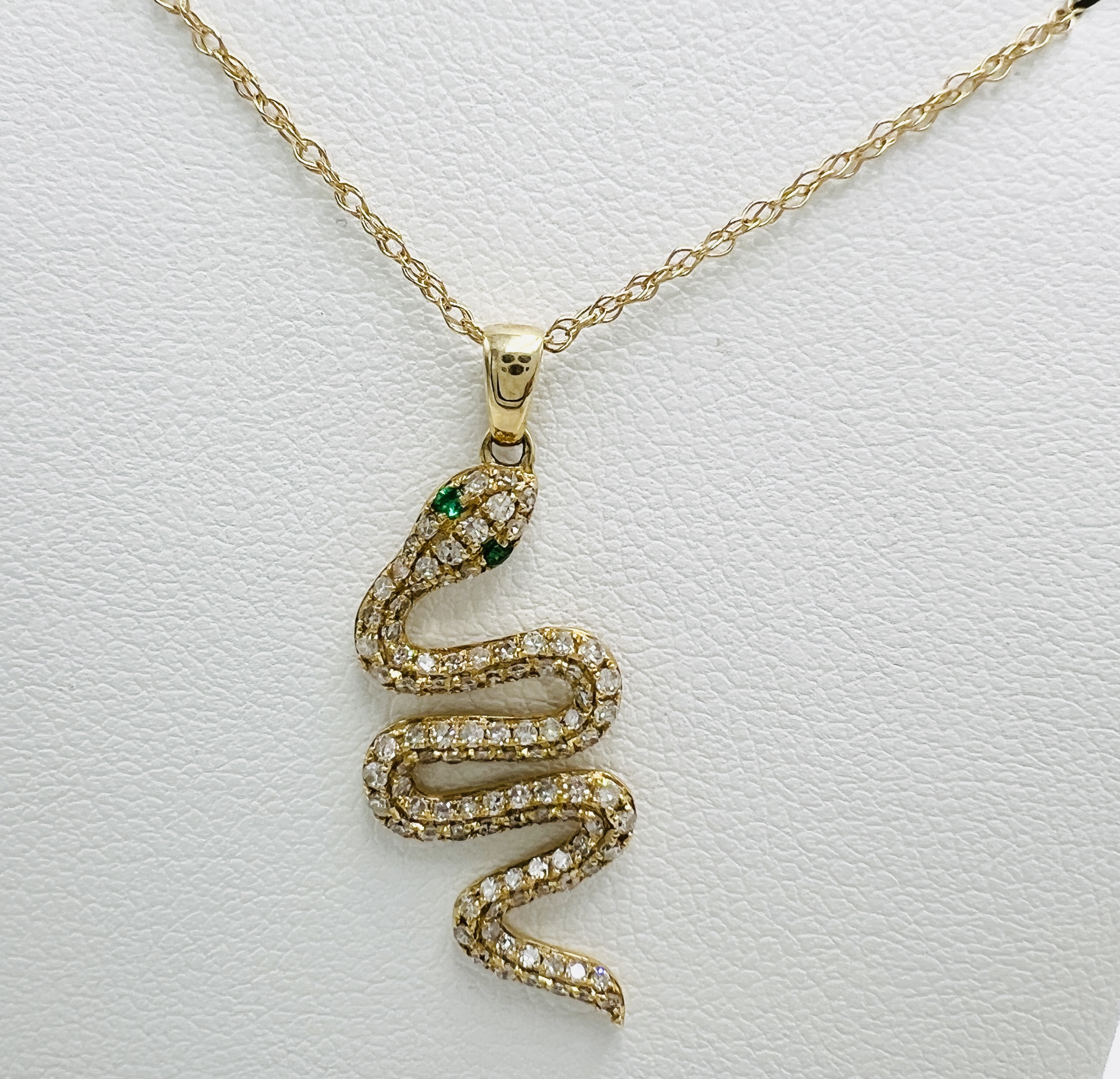 14K Yellow Gold Diamond Pave Snake With Emerald Eyes Pendant On 18″ Chain