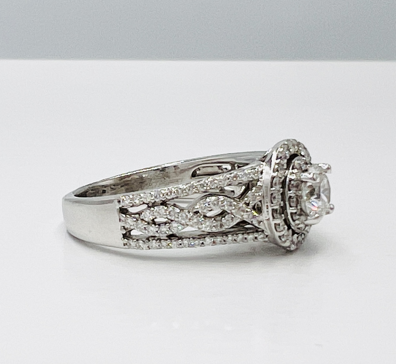 Antique Style 14 kt White Gold Halo Negative Space Ring with a Natural Round 0.52ct H SI2 Center and GIA2216 Total Natural Diamonds1.52ctw Twist Ring