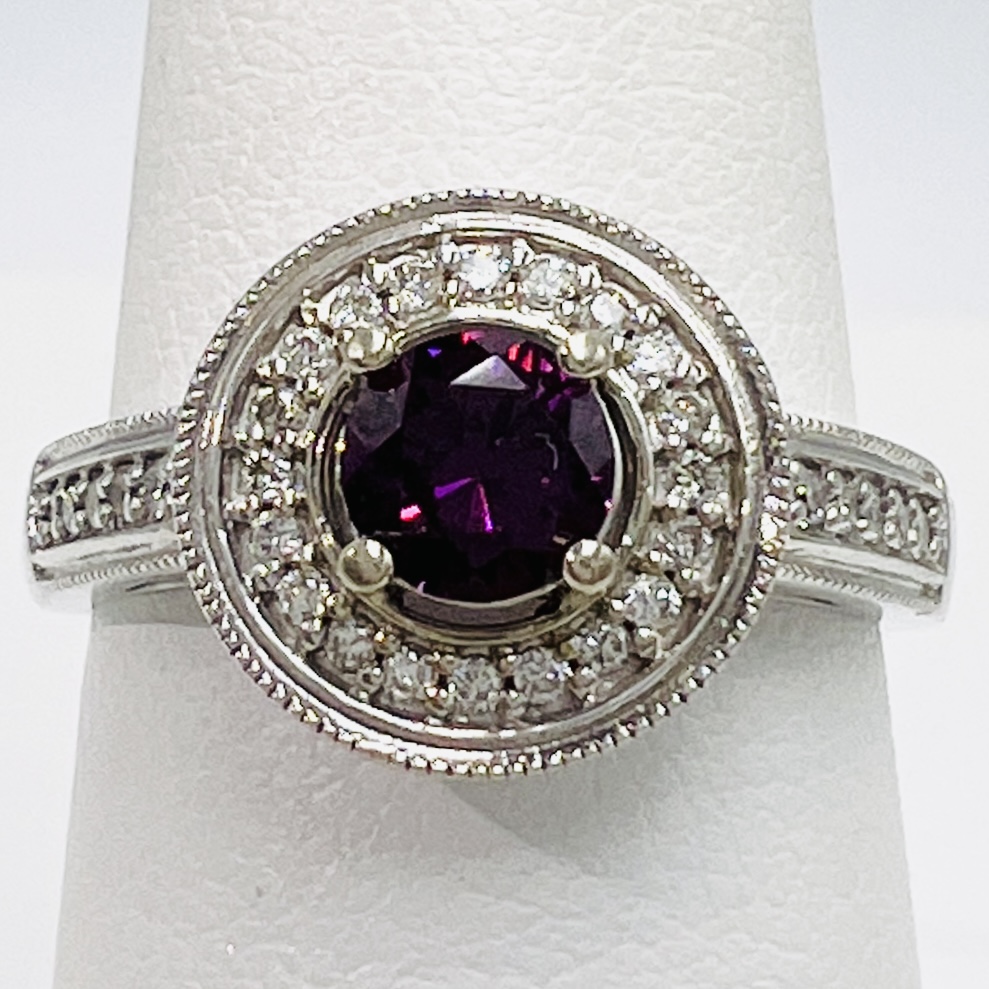 1kt white gold custom ring 0.20 Ctw Halo Diamond/ Purple Garnet Center