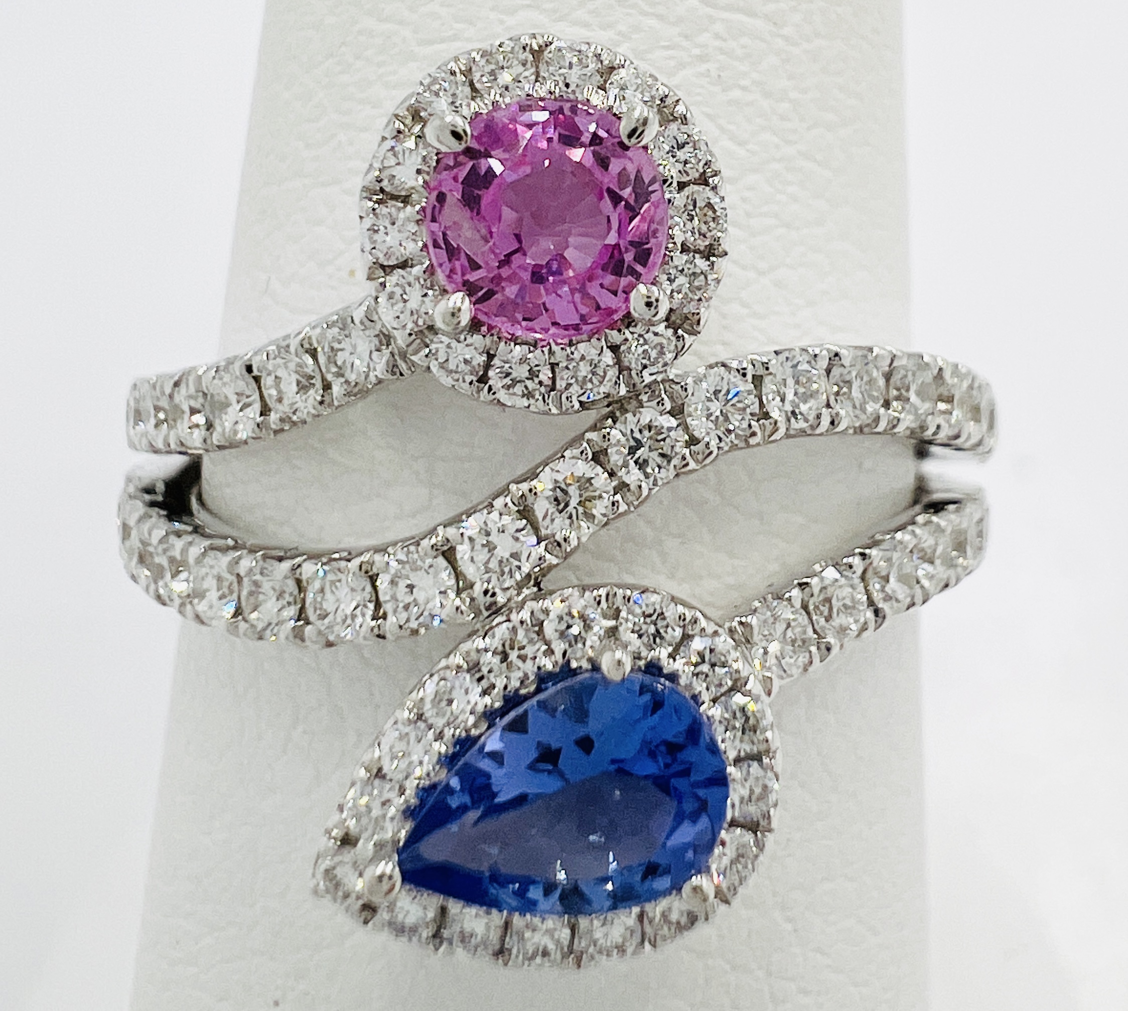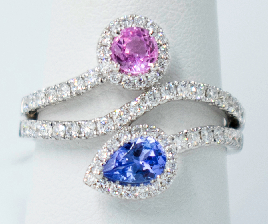 14 White Gold Bypass Fashion Ring with 0.61ct Natural Diamonds and a 0.41ct Tanzanite Pear with a 0.40ct Round Natural Pink Sapphire