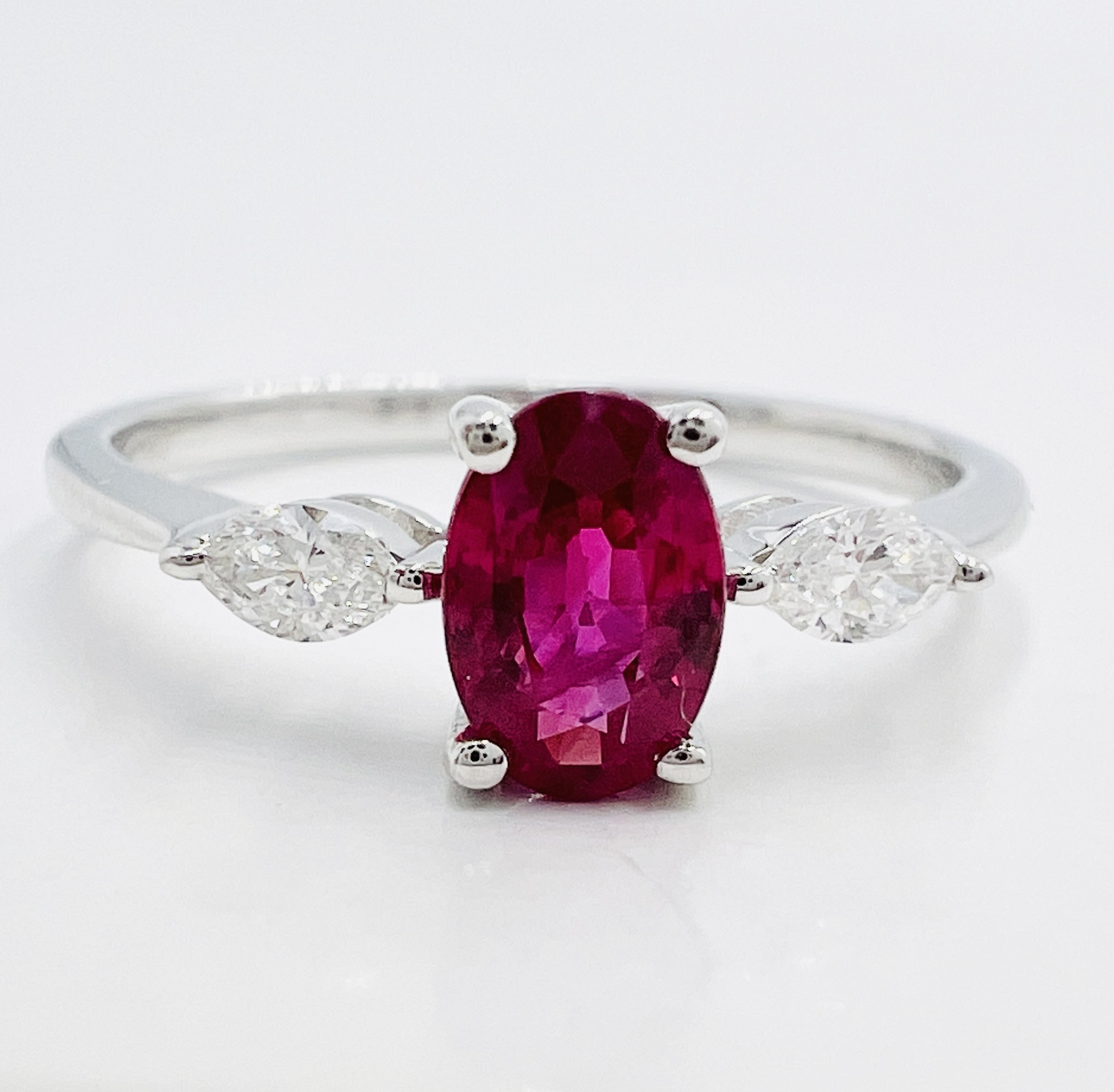 18 k white gold ring natural Ruby 0.64ct, Marquise Diamond 0.15ct