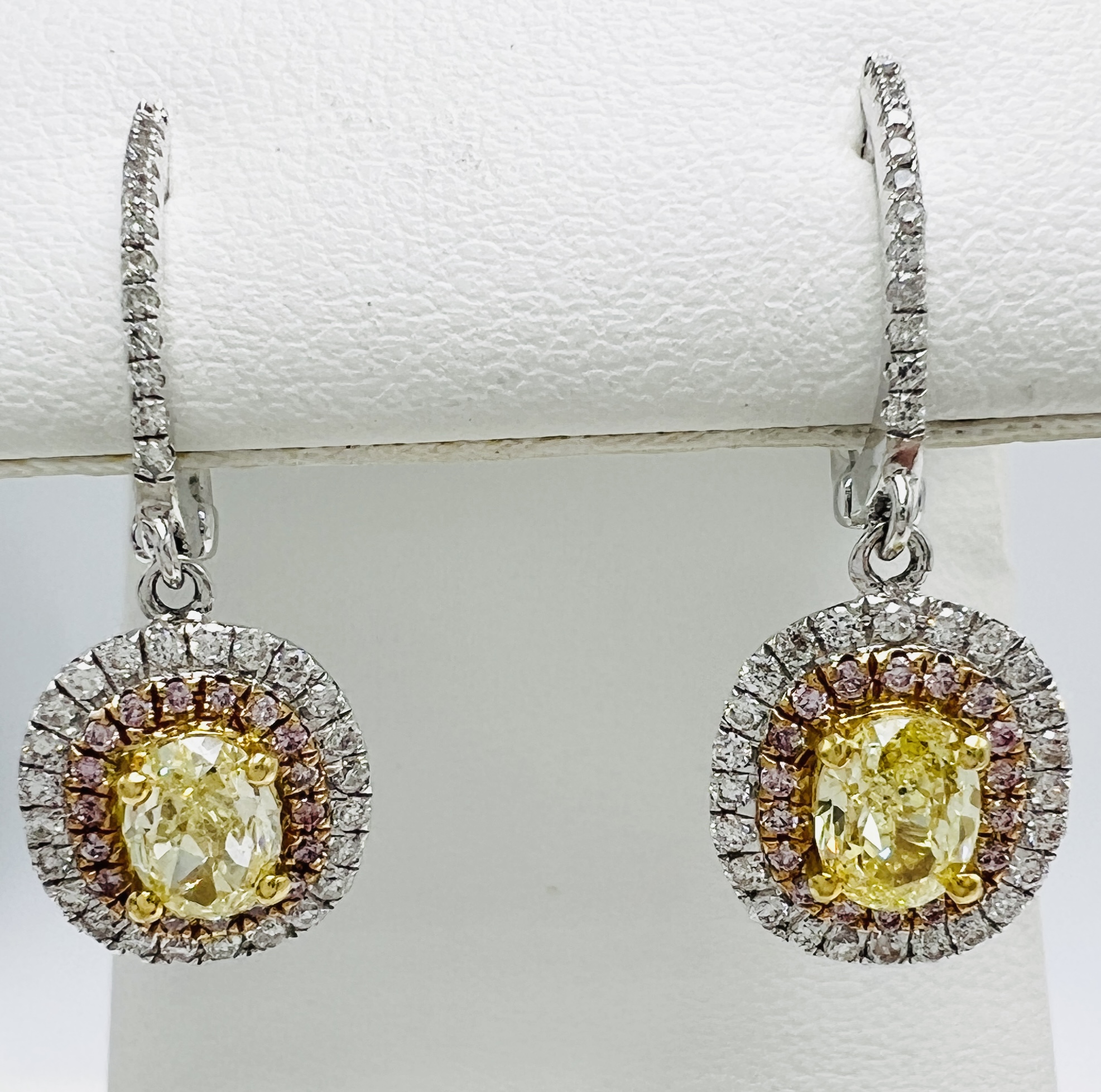 18kt White Gold1.07cts Fancy Yellow Natural Diamond Dangle Earrings .20ct, 0.36cts Pink, 0.37ct White 0.72cts GIA#5172460205 Pink 36