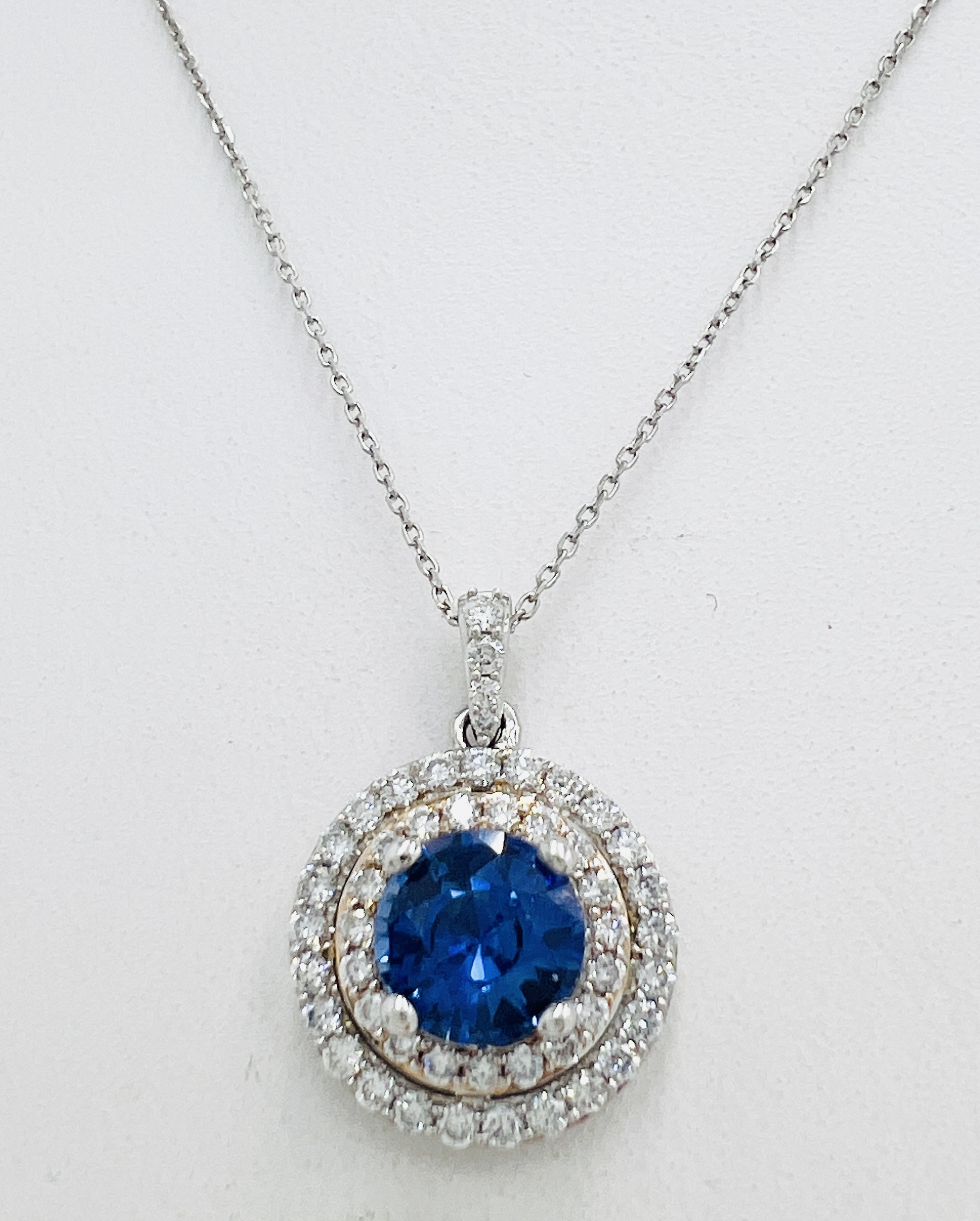 18k white gold 1.40ct Round Ceylon Blue Sapphire AAA quality Halo Diamonds 0.50ctw Pendant with gold chain