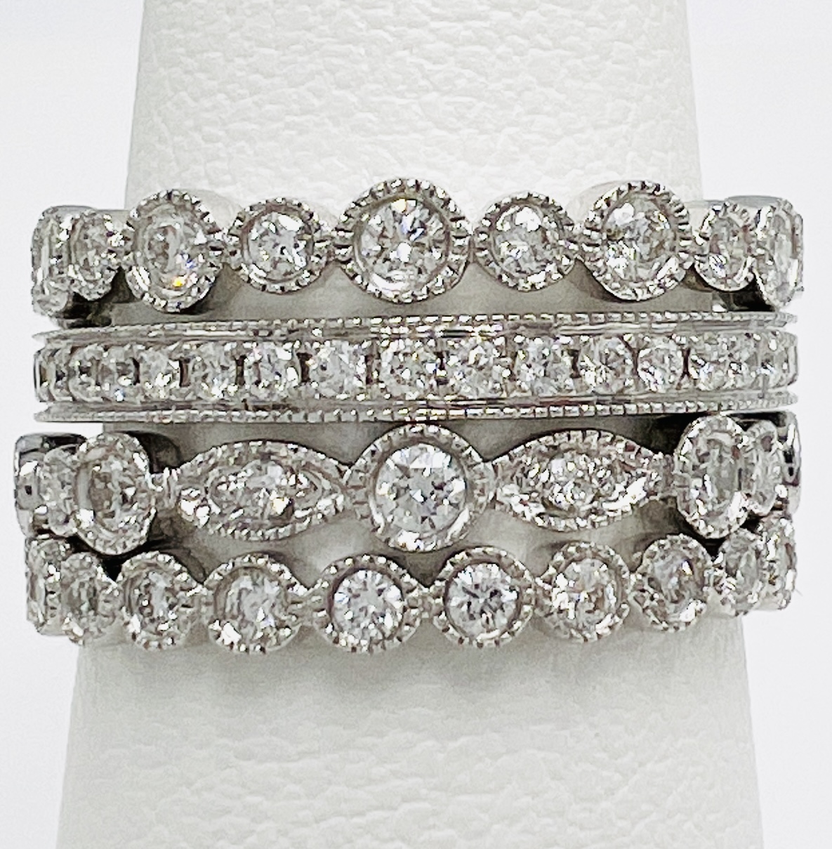 18K White Gold 1.61ctw Vintage Milgrain Diamond Stackable Set 4-rings RD102 -7.19gms
