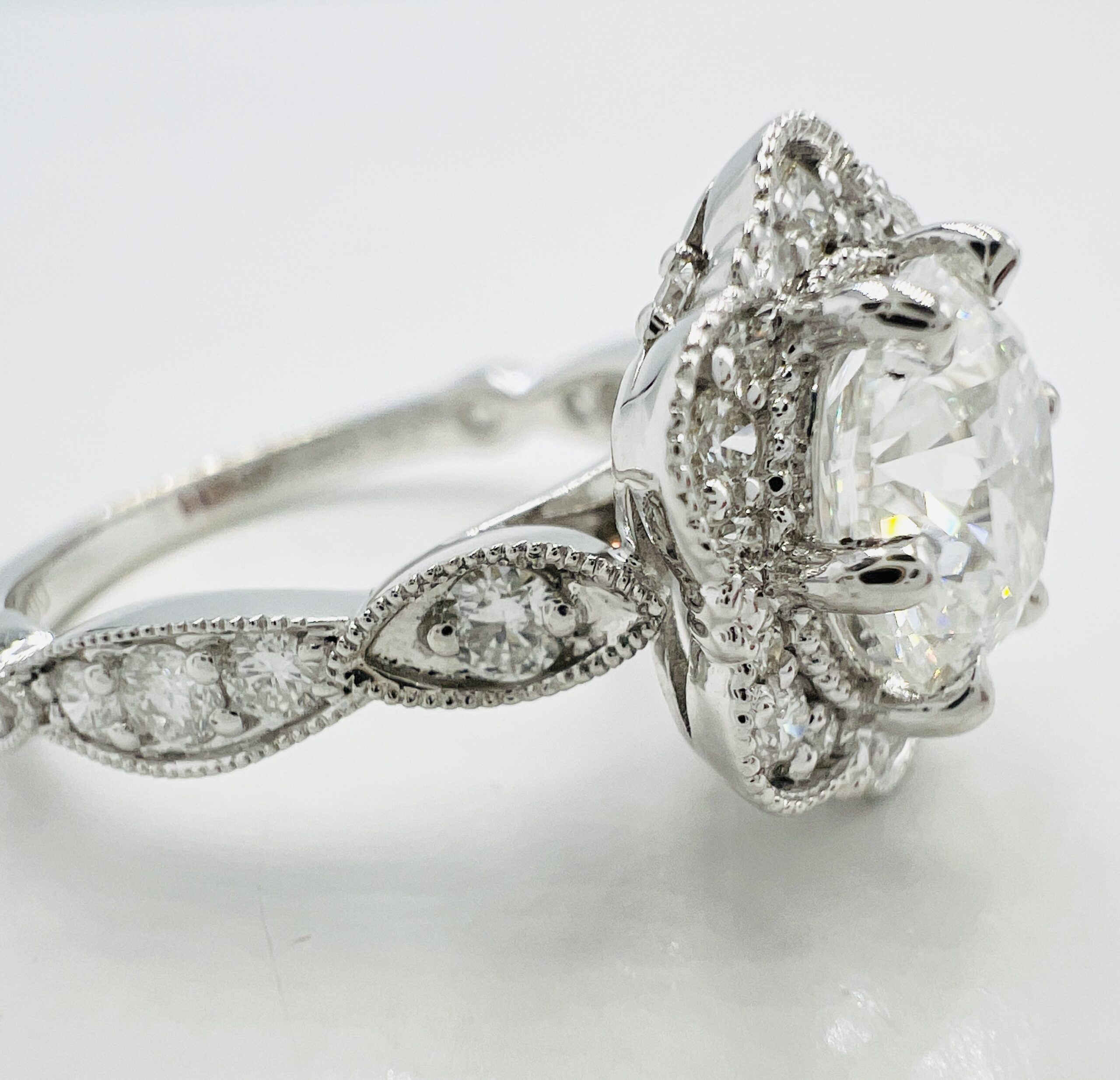 Custom 14k White Gold 1.99ct IGI E VS2 Lab Grown Center Diamond and 0.58ctw Natural Diamond Accents Corsage Flower Halo Size 7 Certificate LG688508469