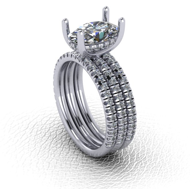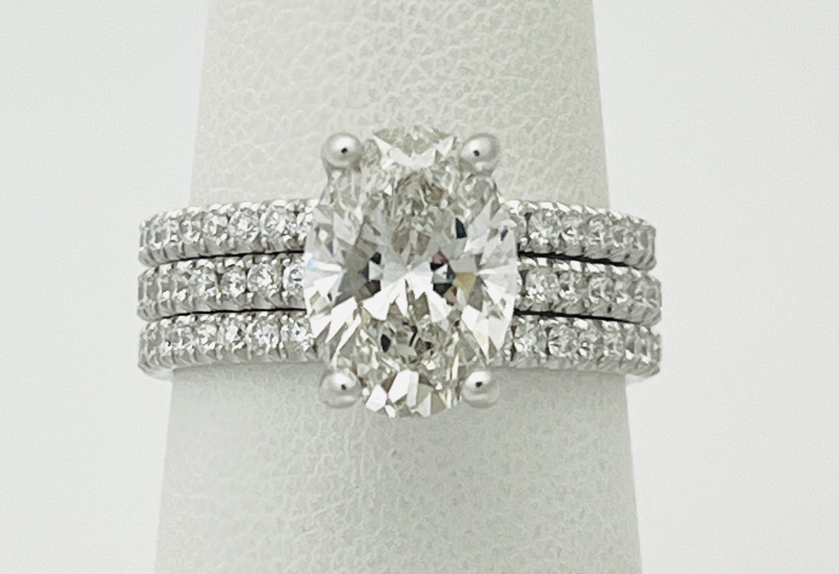 Custom 14k White Gold Hidden Halo Oval Lab Diamond 2.28 carats having G color and VS1 clarity, .30ct Engagement plus two (2) wedding bands 1/3ct Each, 14131 EUSA