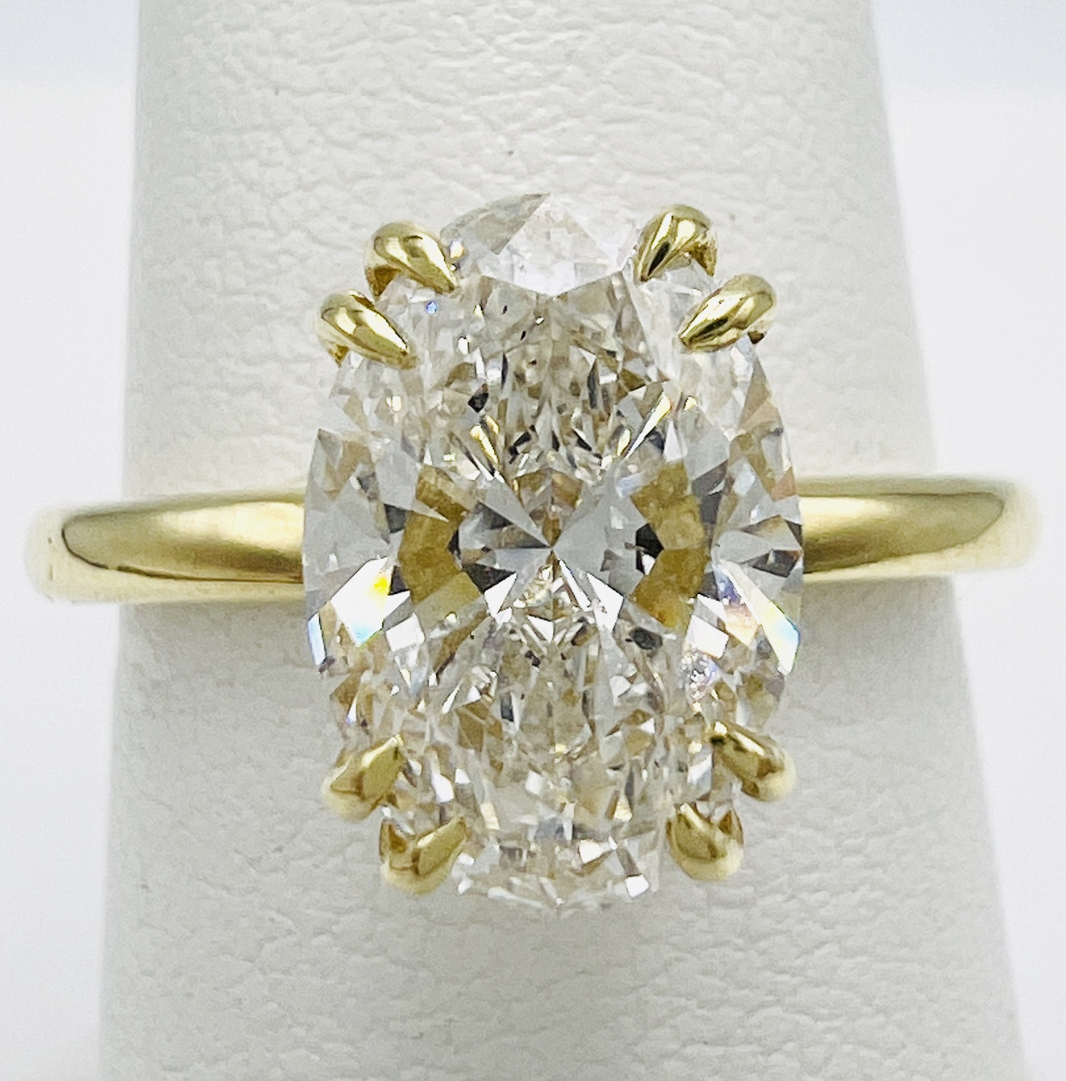 Custom 18KT yellow gold Engagement Ring with a 2.09ct Lab Grown Diamond having E color and VS2 clarity. The Oval Solitare Hidden Halo has a double claw setting.