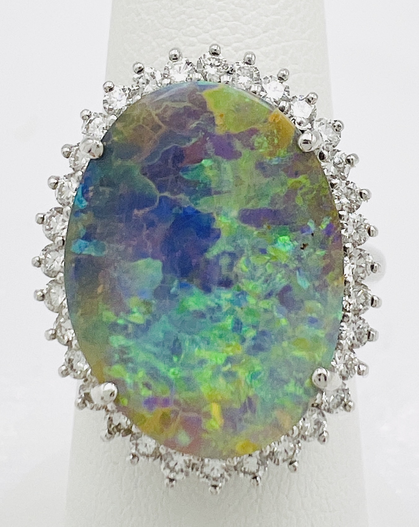 Platinum Halo Ring with a Stunning Natural 9.60ct Australian Boulder Opal Level 4 Brightness and 0.73carats of Natural Diamonds G-H color and VS clarity