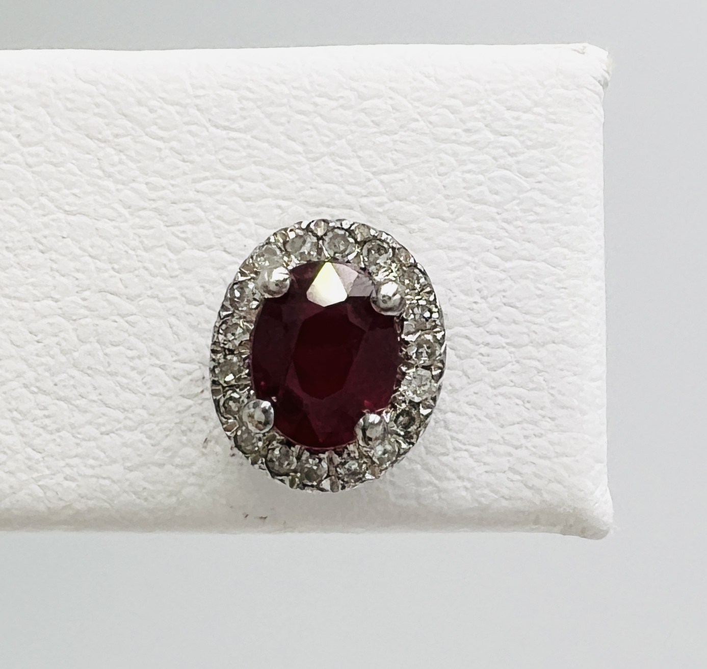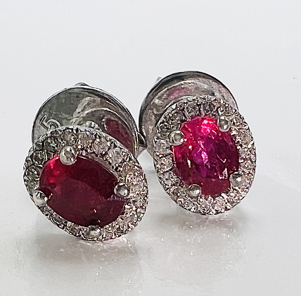Sterling Silver Ear studs with 5.5mm x 3.5mm oval natural AA quality Ruby weighi9ng 0.70cts total weight and .20ctw Natural Diamonds in the halo.