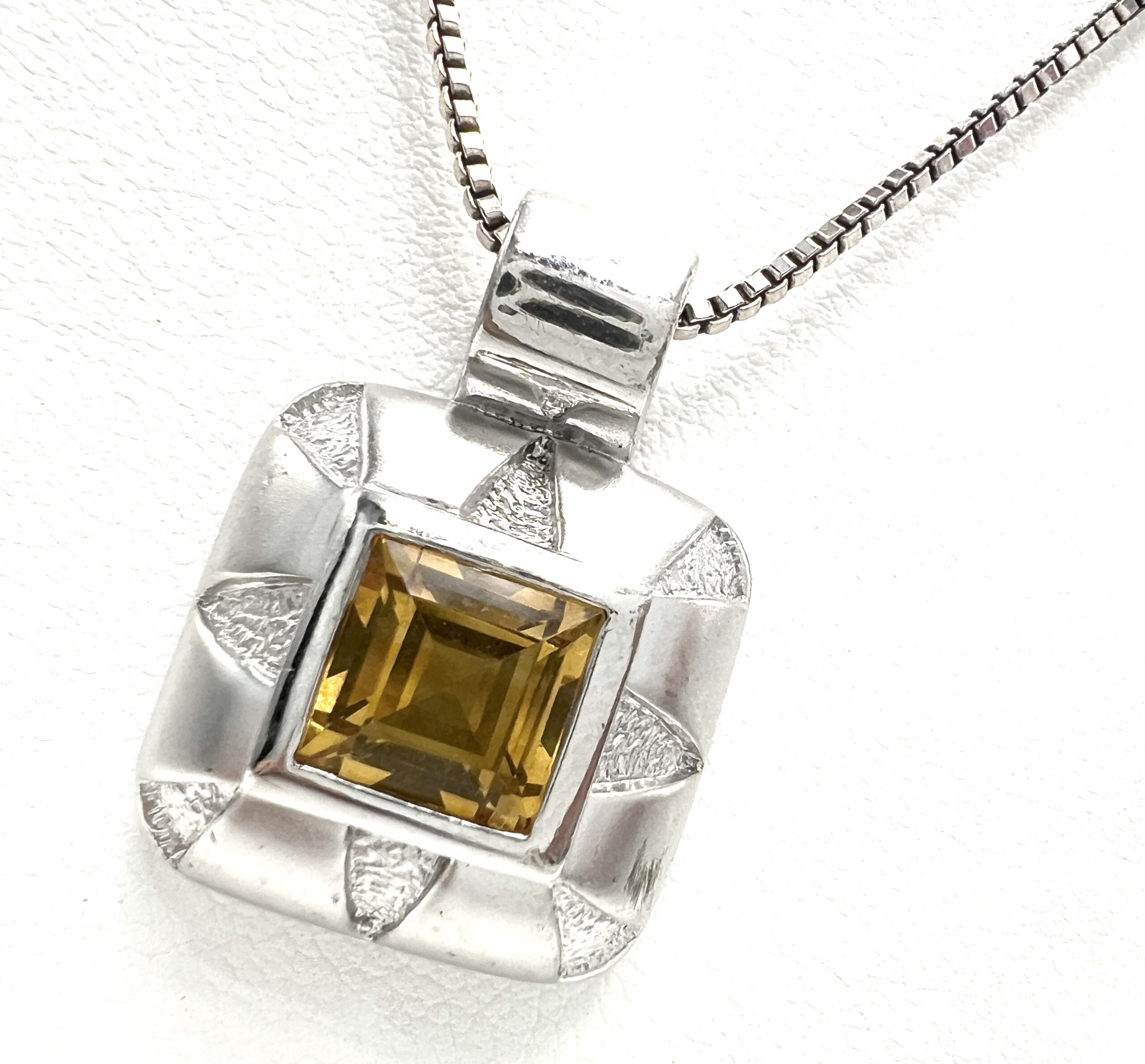 Sterling Silver Bali Style 10mm Princess Yellow Citrine 3 carats Pendant with Chain Box