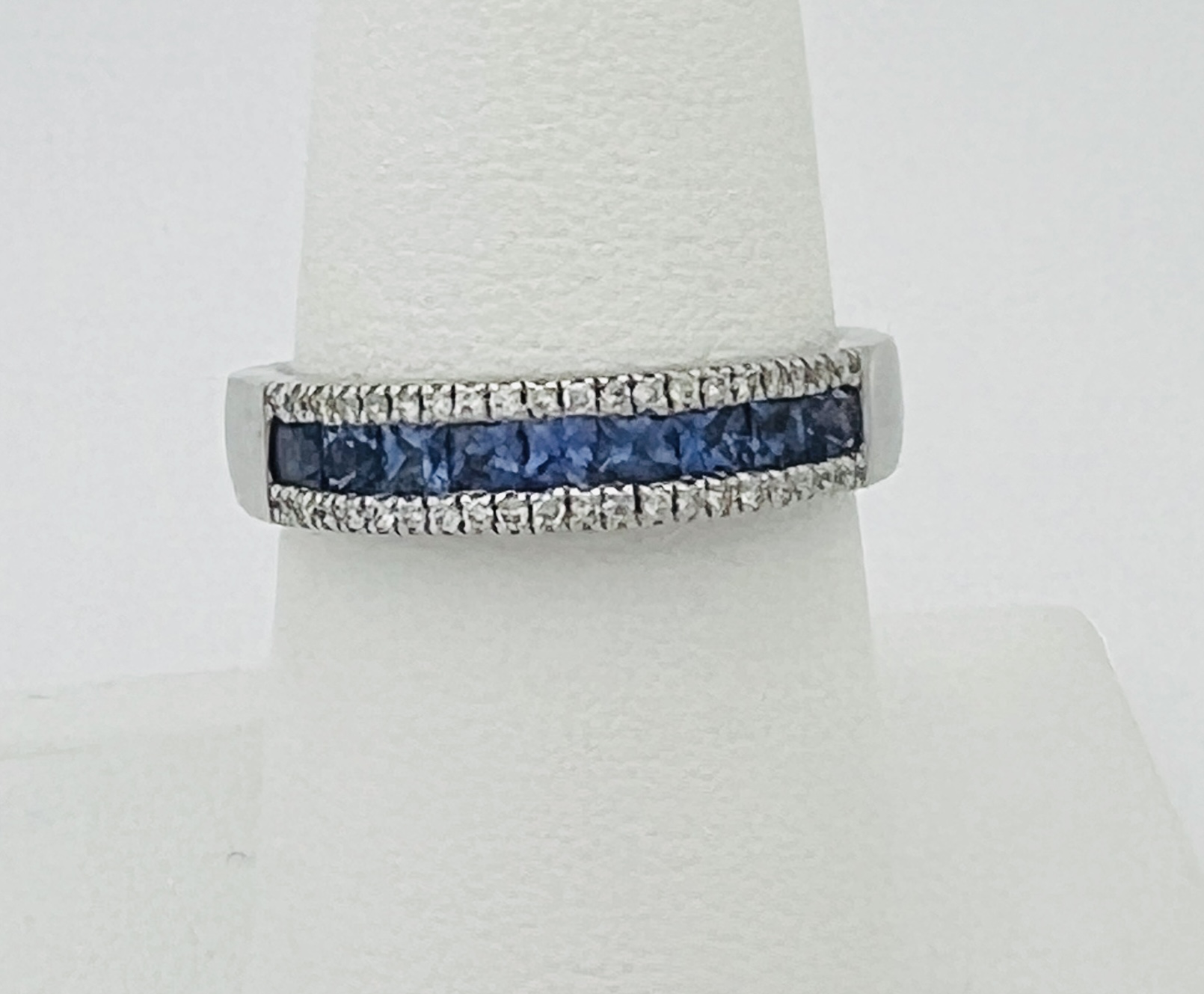 Sterling Silver Channel Set Princess Cut Natural Blue Sapphires w/ Diamond Accents 0.25 cts Band Size 7