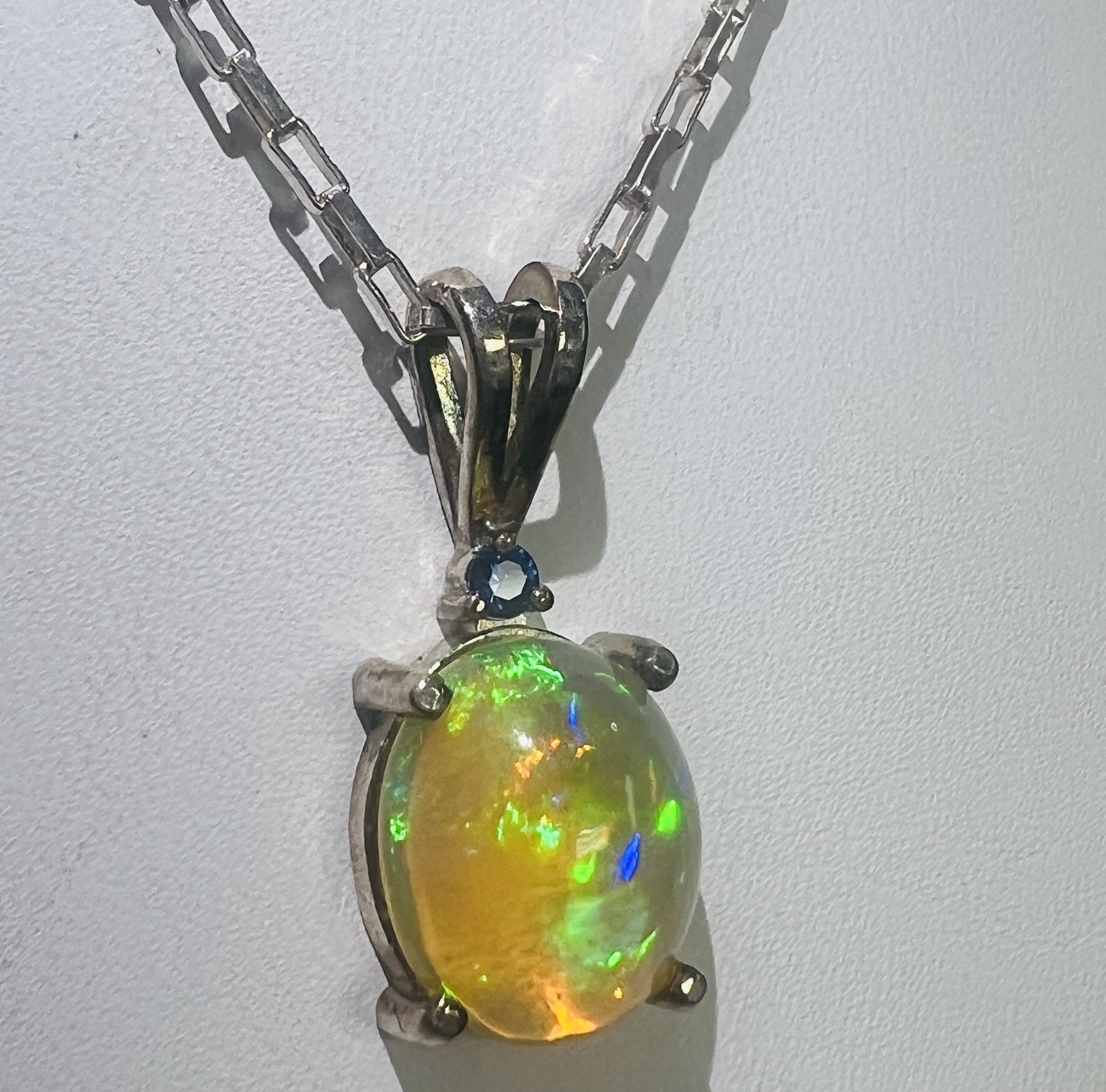 Sterling Silver Ethiopian Opal 11x9mm oval with a Sapphire Accent Pendant and Silver Cable Link Chain